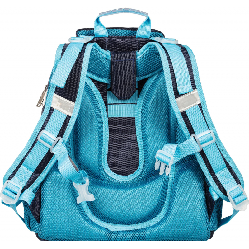 Ранец имеет две ручки: узкую, чтобы вешать на парту, и широкую, чтобы удобно носить в руке. Удобные лямки из воздухообменного сетчатого материала регулируются по длине и по спинке ранца — удобно подогнать под рост ребёнка. Грудная застёжка помогает лучше зафиксировать ранец на теле и снять часть нагрузки с плеч. Плотное дно удерживает форму. Для безопасности ребёнка в тёмное время суток предусмотрены светоотражатели на передней части ранца, на лямках и над боковыми карманами.
