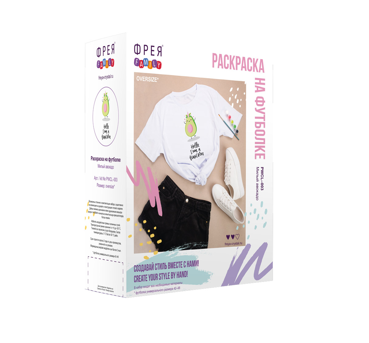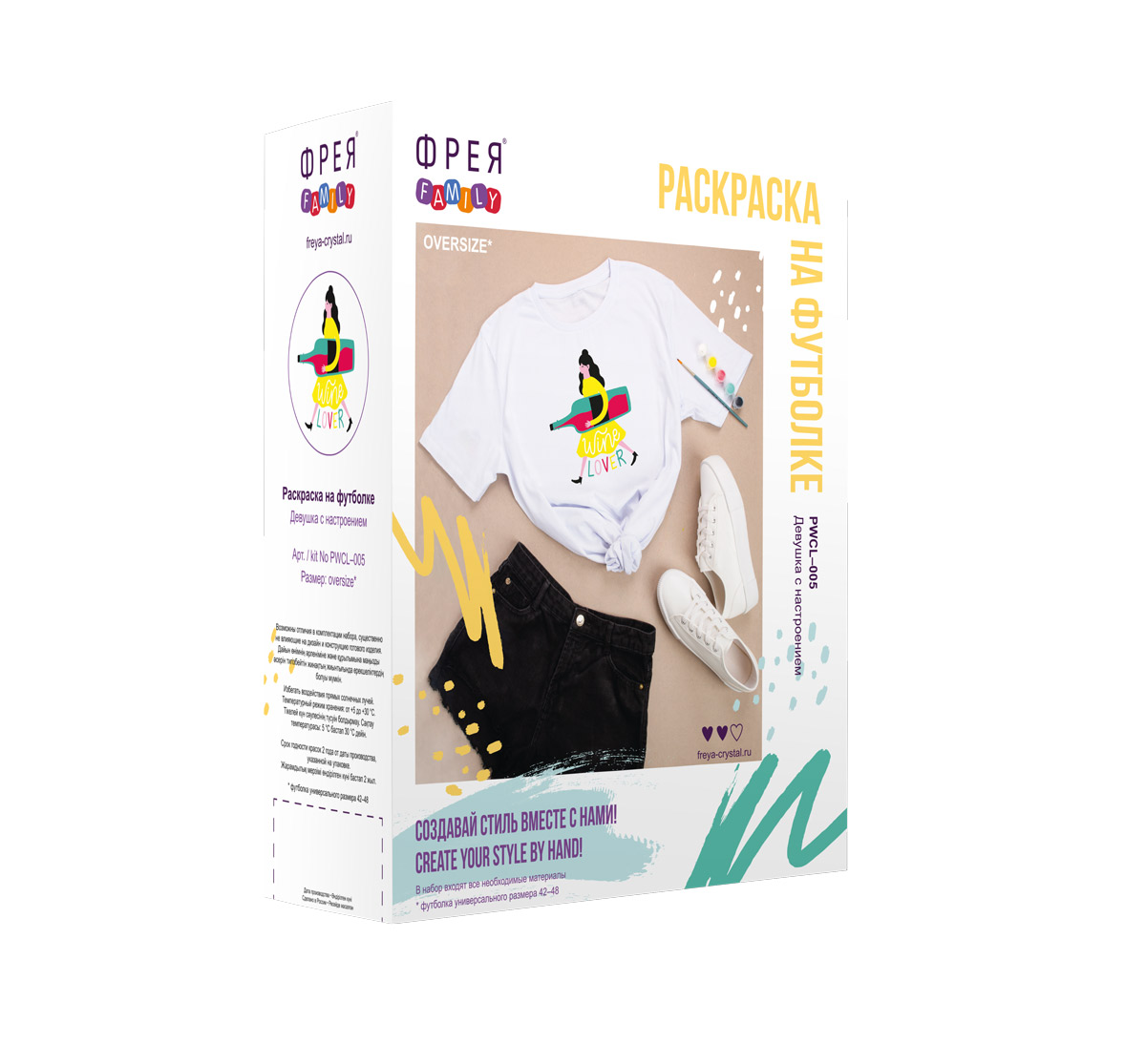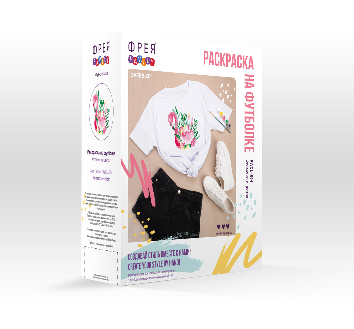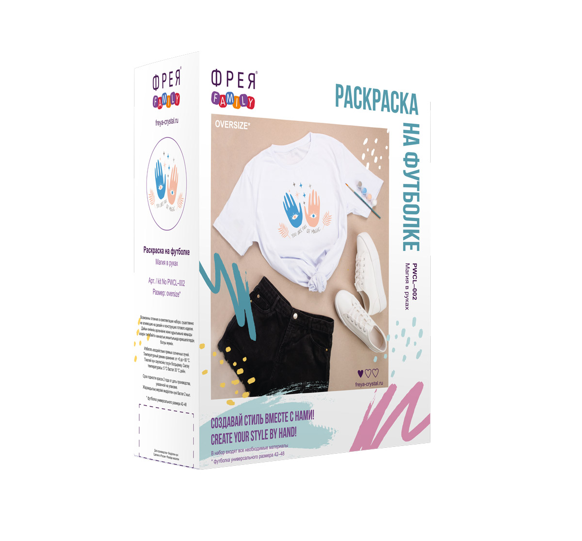 В набор входят: футболка 100%-ный хлопок размера oversize с нанесённым контуром, профессиональная кисть, краски по ткани и подробная инструкция.