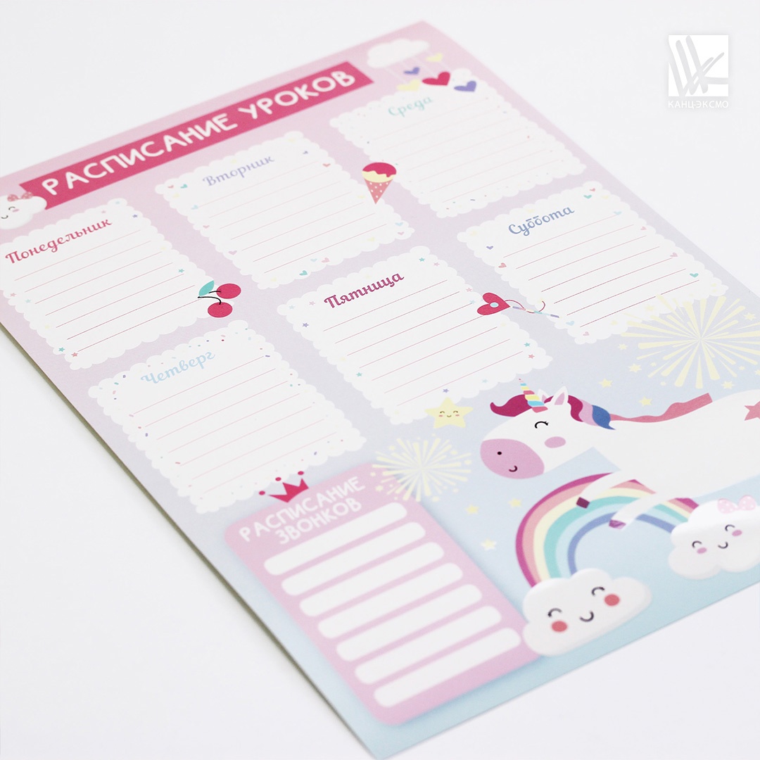 Расписание уроков от «Эксмо» дисциплинирует, учит самостоятельности и помогает рационально организовать время и подготовить все необходимое для следующих занятий. Выполнено с отделкой выборочным лаком из высококачественной мелованной бумаги формата А4. Для удобства изображена шестидневная учебная неделя с семью уроками на каждый день.