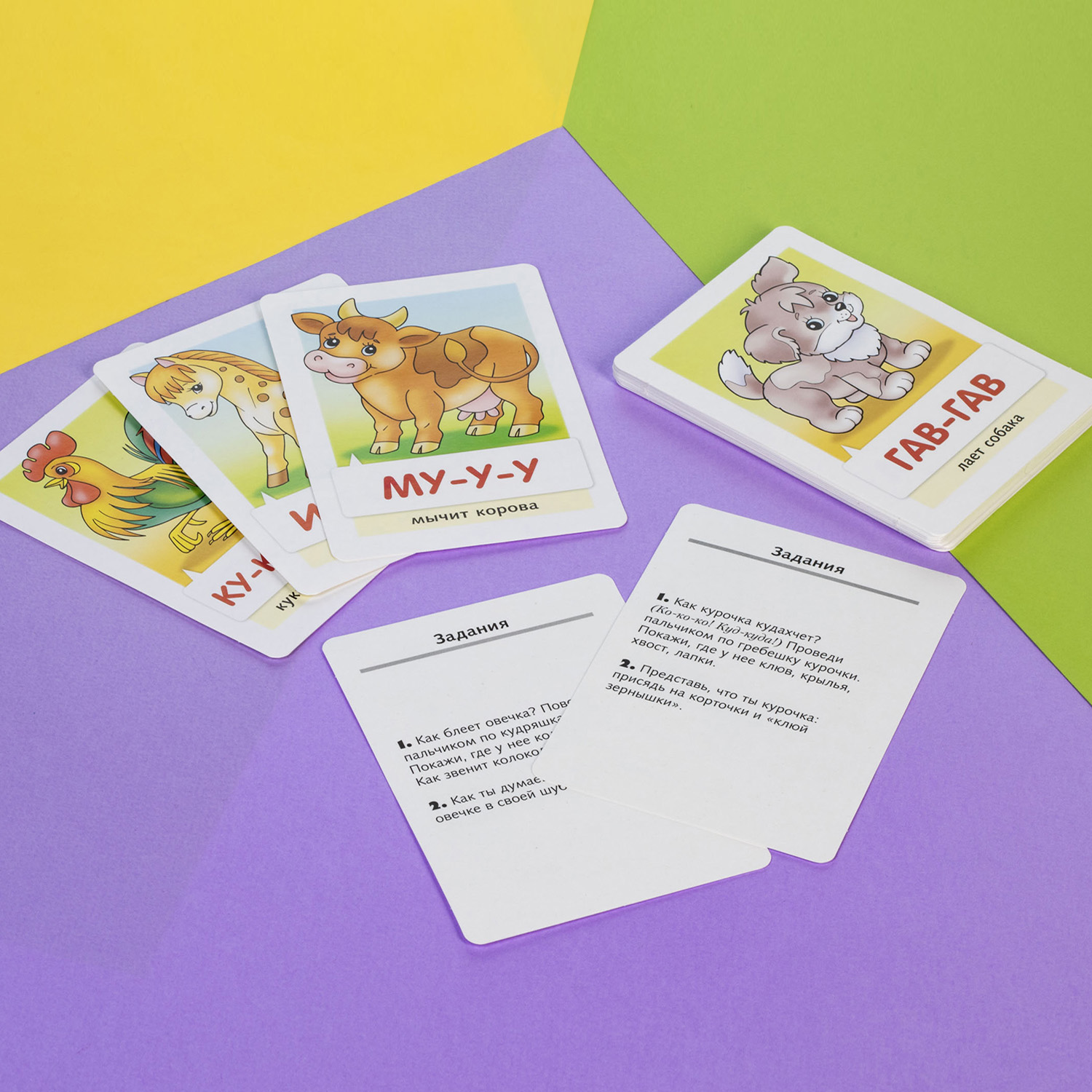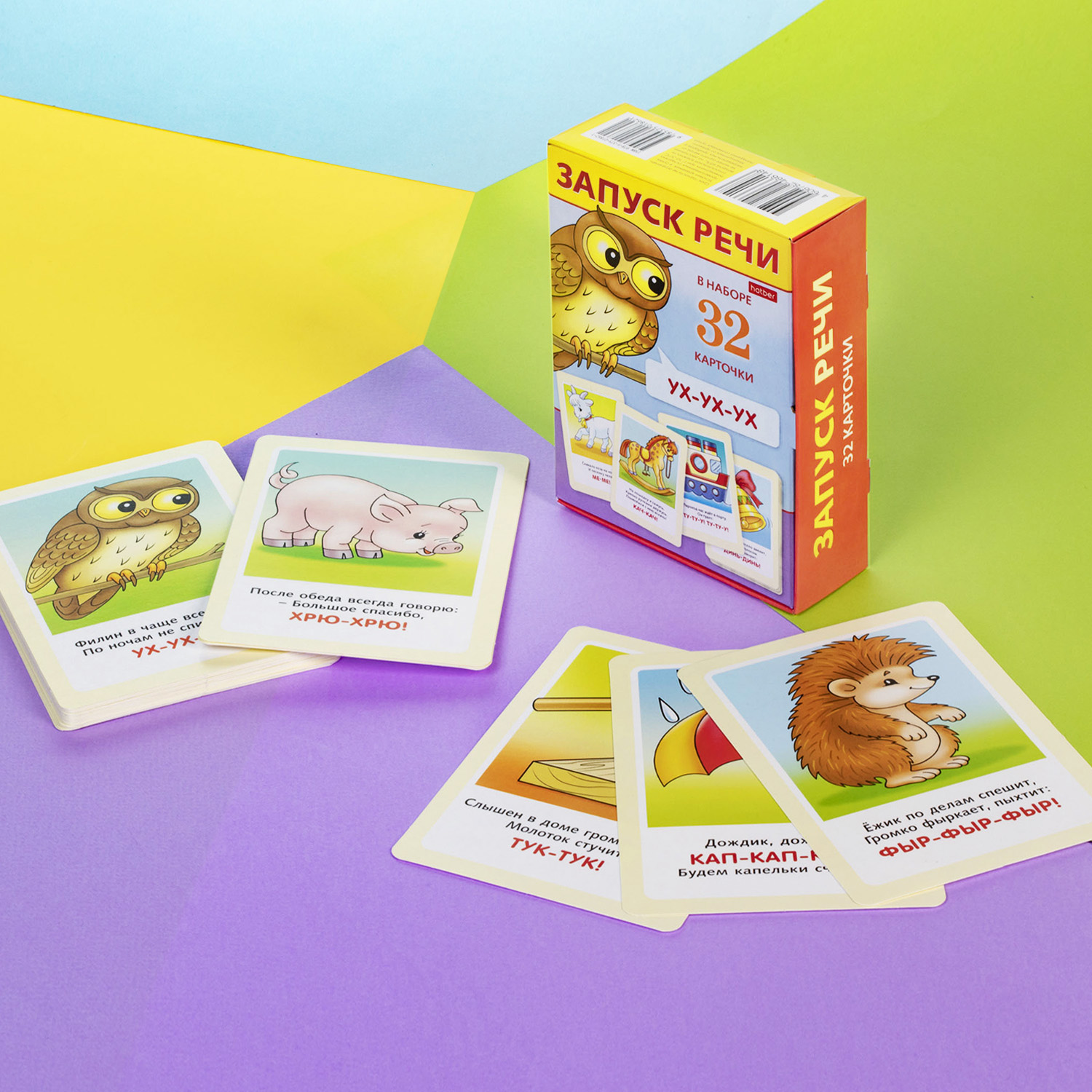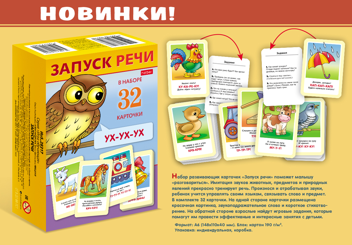 Мы предлагаем вам замечательный набор развивающих карточек «Запуск речи», в состав которого входит 32 карточки с имитацией разных звуков, повторяя которые ребёнок будет тренировать навык речи. Помимо этого, на карточке есть картинка с привязкой к звукам и короткий стишок, что дополнительно формирует интерес и развивает мышление. На обратной стороне карточки вы найдёте полезные задания-подсказки для проведения веселых и познавательных занятий.