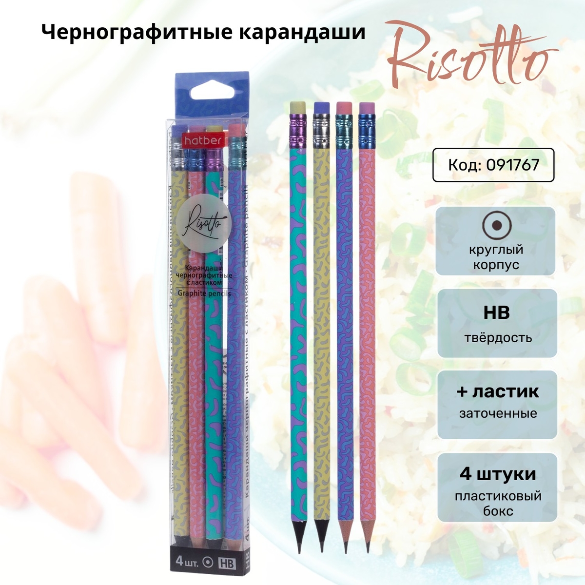 Чернографитные карандаши Risotto от Hatber — отличный вариант для домашней, учебной и рабочей канцелярии! Карандаши с ластиком, с заводской заточкой, с грифелем твердостью HB. Стильно выглядят! Принт на корпусе выполнен из 4 актуальных пастельных оттенков и похож на мелкую текстуру итальянского ризотто.