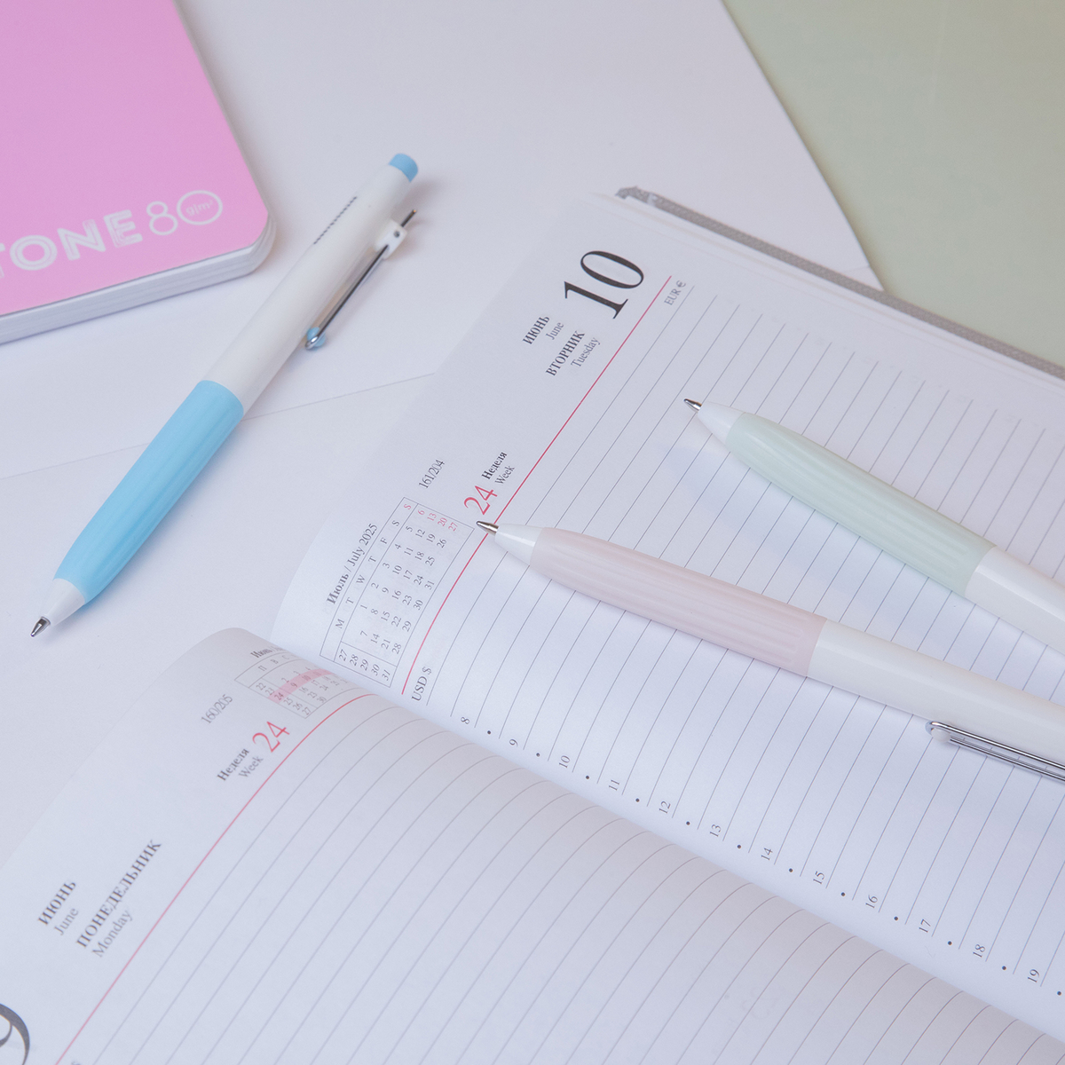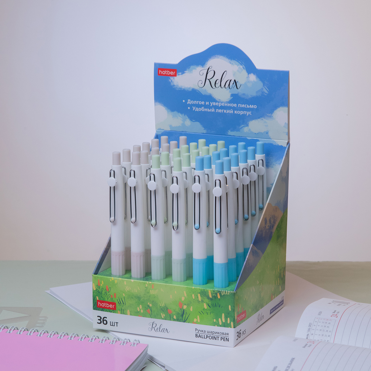 Дисплейный бокс с «летним» пейзажем и воздушным небом превращает выкладку в аккуратный мини-островок на витрине, а сочетание мятных, голубых и кремовых оттенков делает ручку стильным и универсальным аксессуаром. Такая новинка хорошо впишется и в школьный, и во взрослый офисный ассортимент.
