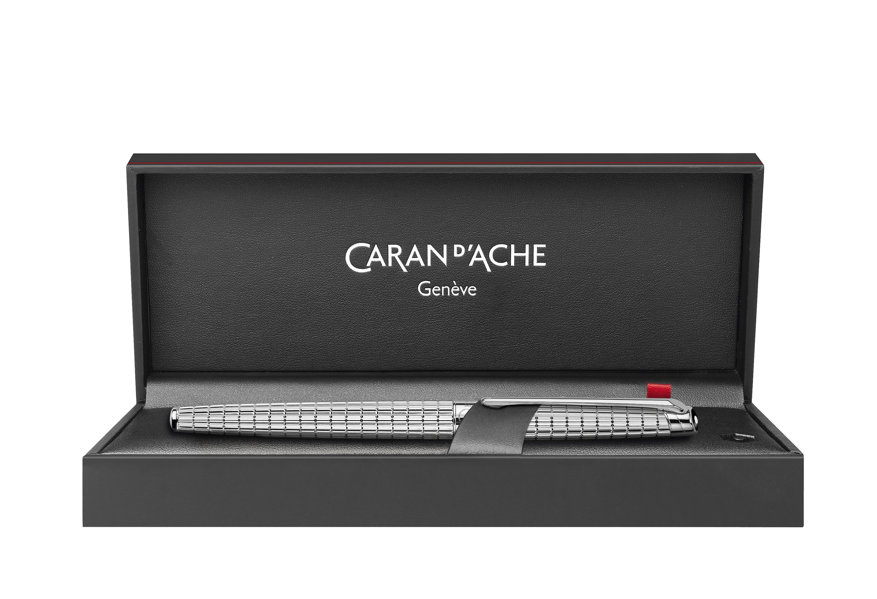 Для новинок характерны округлый корпус с родиевым и серебряным напылением, глубокая алмазная гравировка с багетной огранкой и выгравированный логотип Caran d’Ache, а также перо из 18-каратного золота с родиевым покрытием и высокоточный поворотный механизм (у шариковой ручки).