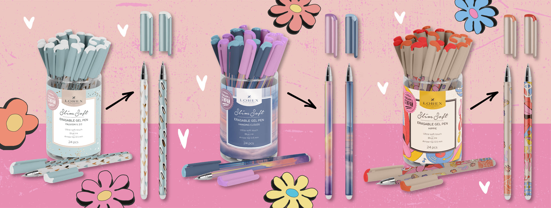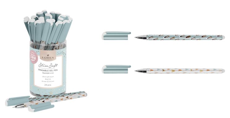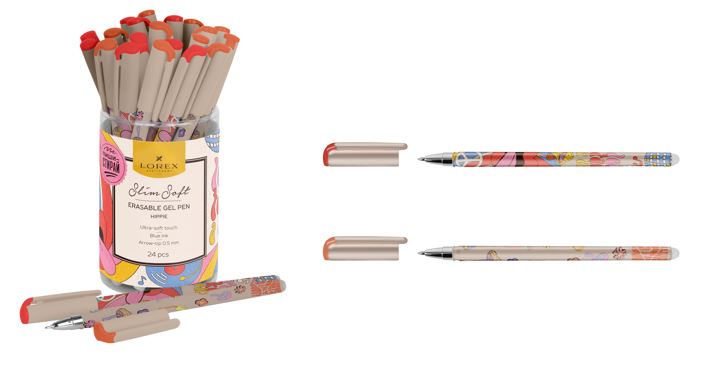 Сейчас среди покупателей канцелярии выявился большой спрос на ручки со стираемыми чернилами. Поэтому мы расширили категорию «пиши — стирай» в LOREX и представляем вам новые дизайны. Вы найдёте в новинках и пушистые облака, и эстетику хиппи 60-х, и элегантный фовизм с золотыми штрихами. А самое главное — теперь в каждом тубусе вас ждёт ассорти из двух принтов! Потому что мы считаем так: красоты должно быть больше, ещё больше.