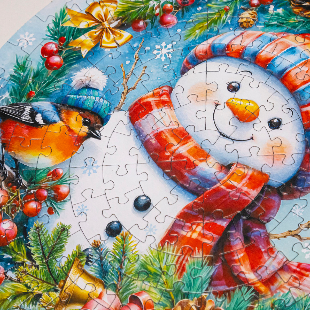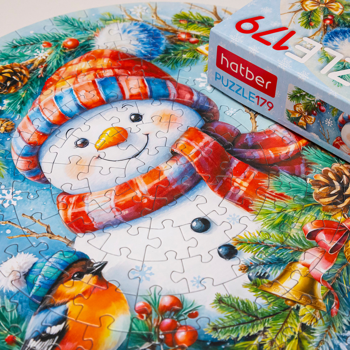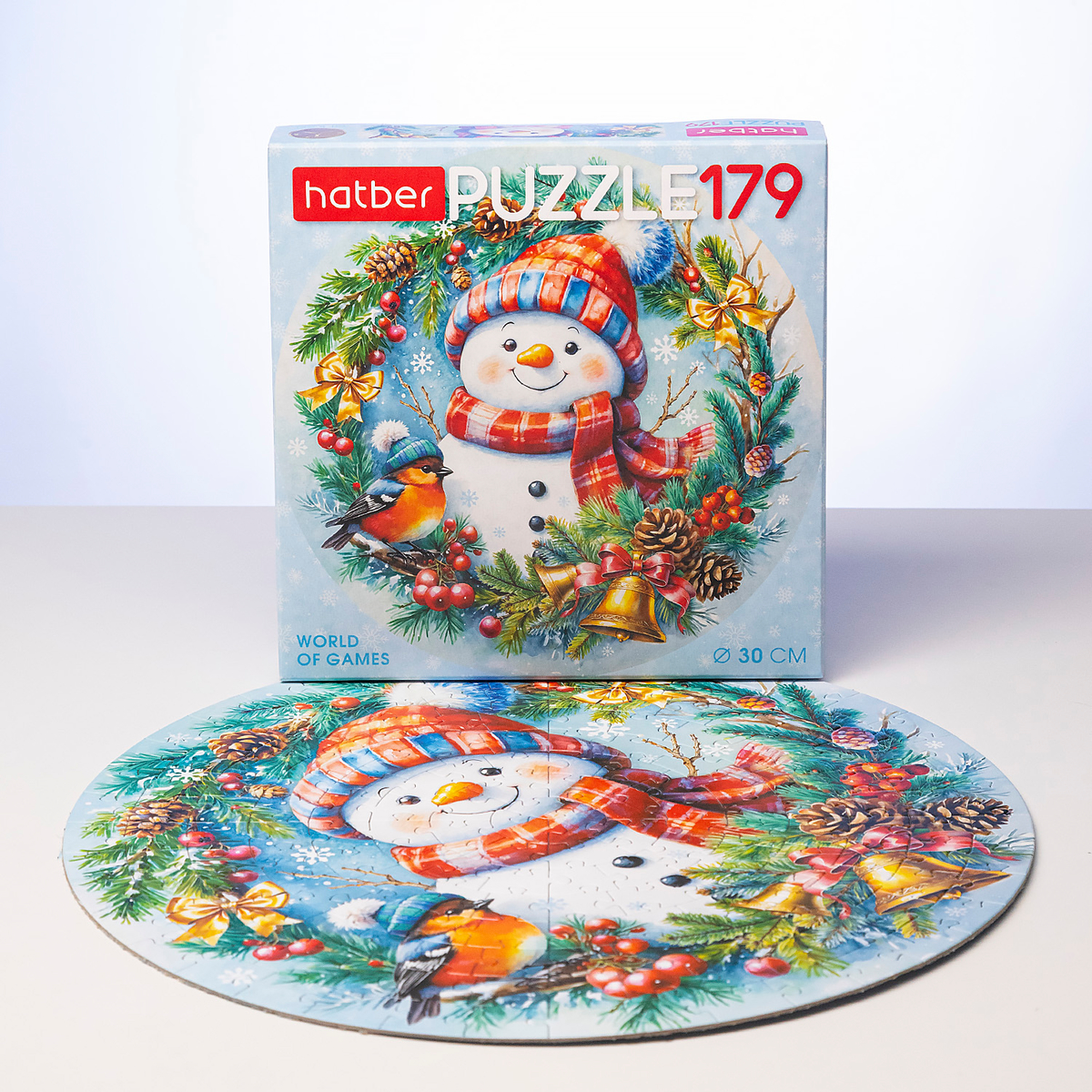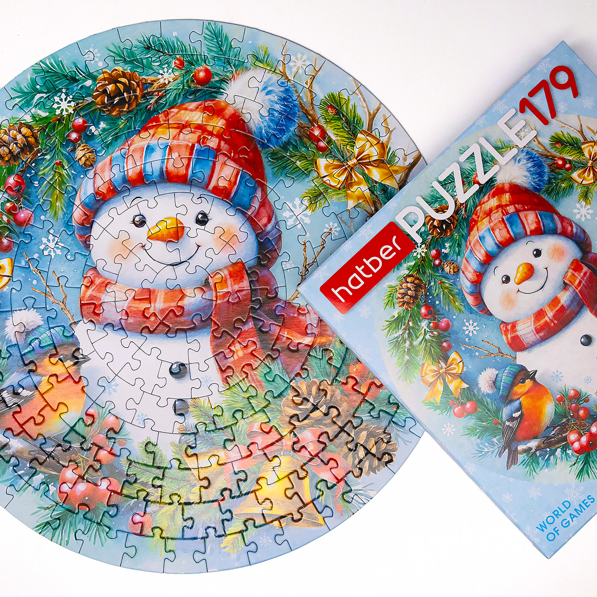 Соберите мгновения радости вместе с новым круглым пазлом от Hatber — где каждый кусочек наполнен волшебством зимы! Улыбающийся снеговик в пуховом шарфике и шапке встречает вас в центре искрящегося венка, а вокруг — весёлые снегири, хвоя, золотистый звон колокольчиков и вихрь новогоднего настроения.