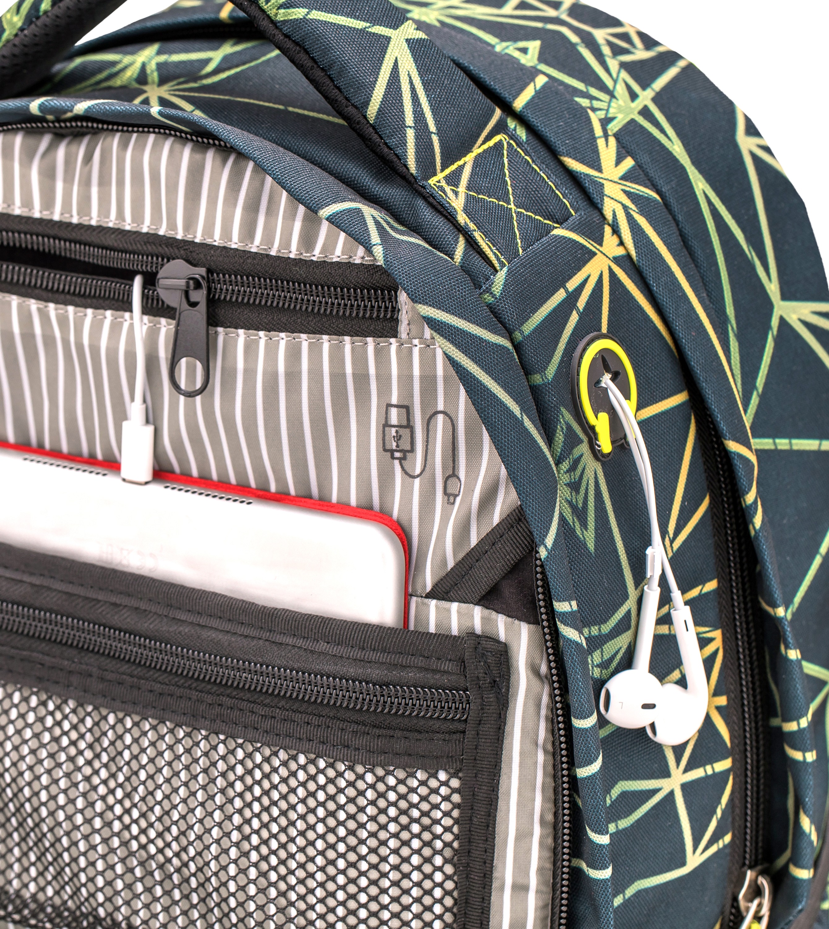 Нагрудный и набедренный ремни надёжно фиксируют рюкзак на спине. Набедренный ремень можно снять, если в нём нет необходимости. Эластичные боковые карманы, регулируемые наплечные лямки, карман для очков и скрытый карман на спинке для проездного. Сама спинка выполнена из воздухопроницаемого материала, благодаря которому спинка ребенка не запотевает при ношении рюкзака.