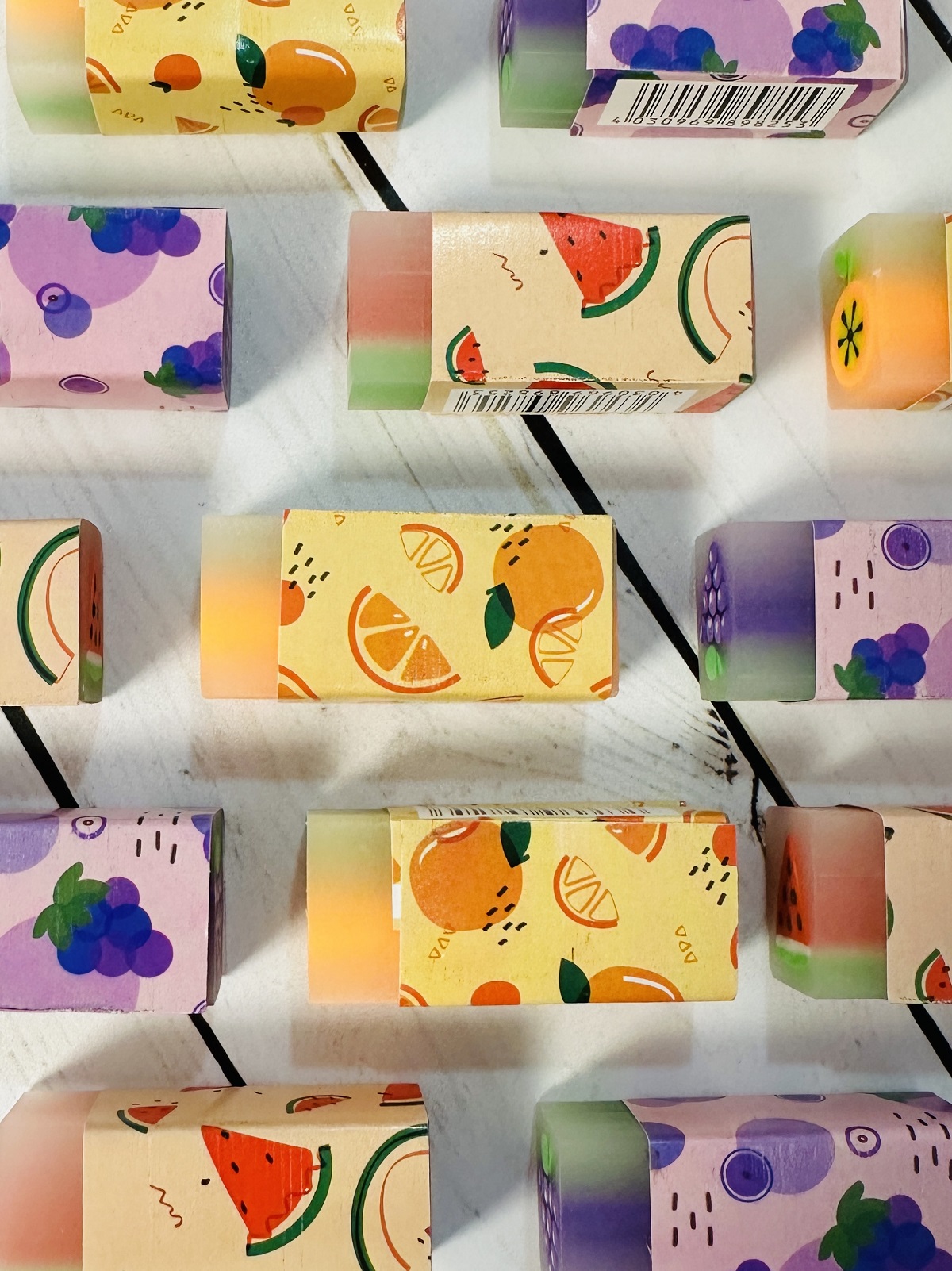 Ластики с изображениями фруктов имеют приятный ненавязчивый аромат.