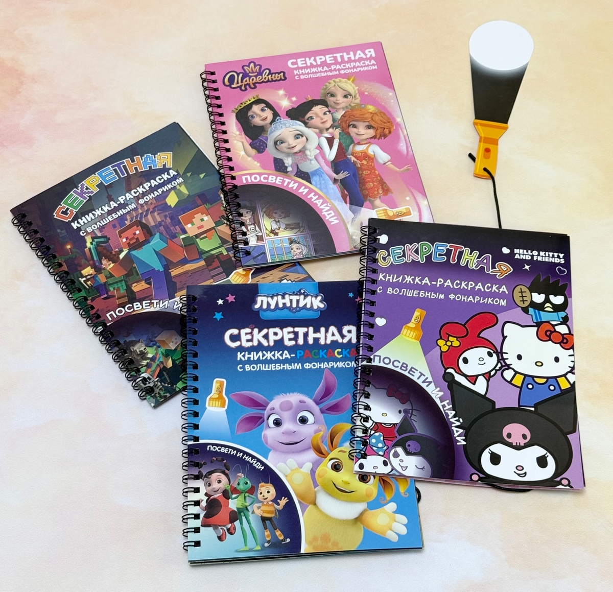 Секретные книжки-раскраски с волшебным фонариком позволят почувствовать себя настоящим детективом. Вас ждут увлекательные задания на внимательность и сообразительность. Справиться с задачами вам поможет специальный фонарик. Он выполнен из картона и прикреплён к книжке с помощью шнурка.