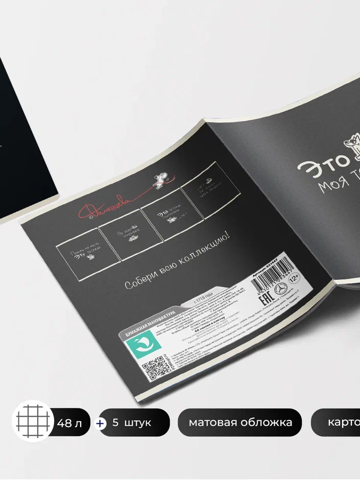 Каждая тетрадь оформлена с чёрным шиком и игривым юмором. Готовы удивить своих клиентов? На обложках — минималистичное изображение и смелые фразы, которые говорят: «Я не просто тетрадь, я — твоё вдохновение!».