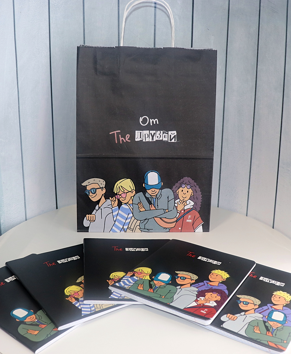 А чтобы сделать подарок ещё более особенным, упакуйте серию тетрадей в бумажный пакет «От Друзей» . Этот пакет также украшен изображениями героев и будет отличным дополнением.