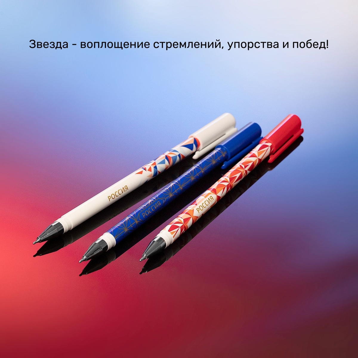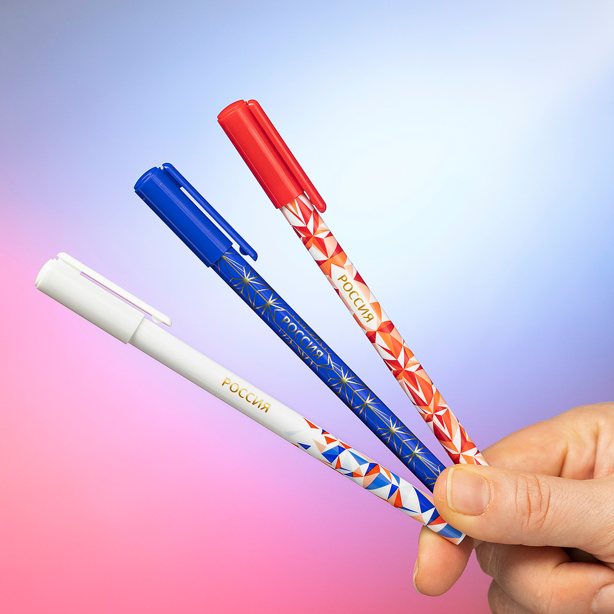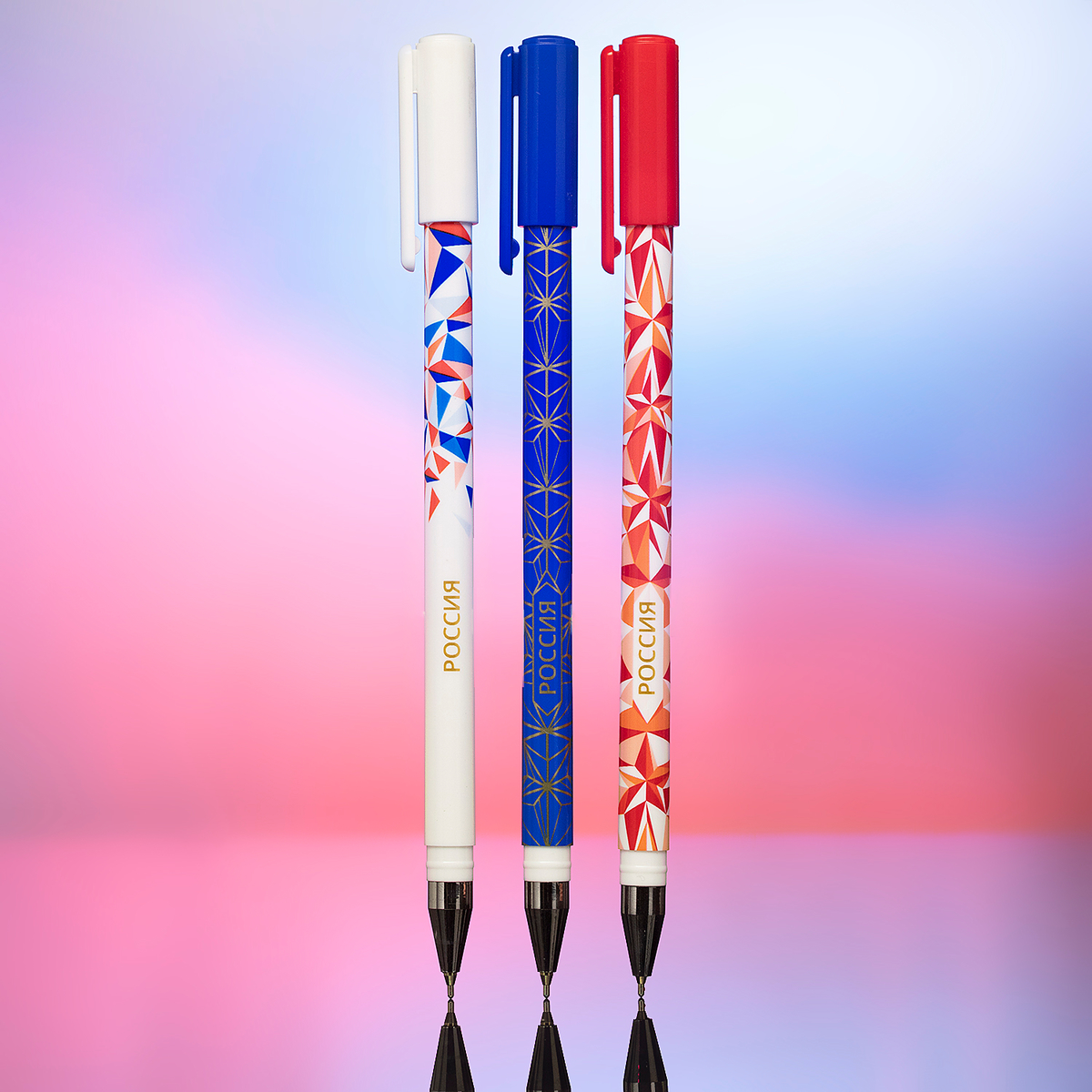 Hatber представляет шариковые ручки «Россия» в трех дизайнах цветов триколора, и в каждом сияют заветные звёзды. Колпачки в том же цвете, что и круглый корпус. Элегантно, геометрично и очень стильно!