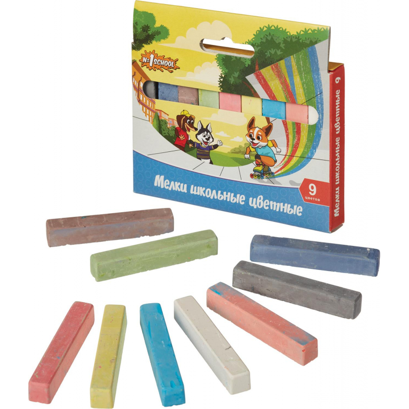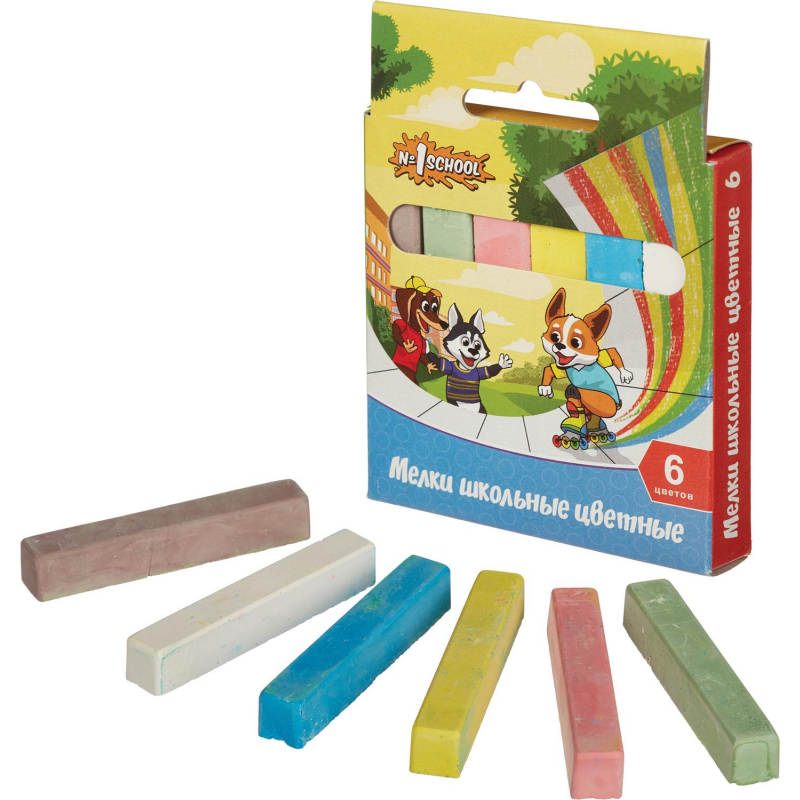 Цветной мел №1 School имеет среднюю твёрдость, в наборе 6 и 9 штук. Изготовлен с использованием натуральных красителей. Мел не крошится и не царапает покрытие. Предназначен для рисования на любой шероховатой поверхности. При соблюдении условий хранения срок годности не ограничен. Цвета в наборе: красный, жёлтый, зелёный, оранжевый, синий, фиолетовый, белый, чёрный, коричневый. Упаковка — картонная коробка.
