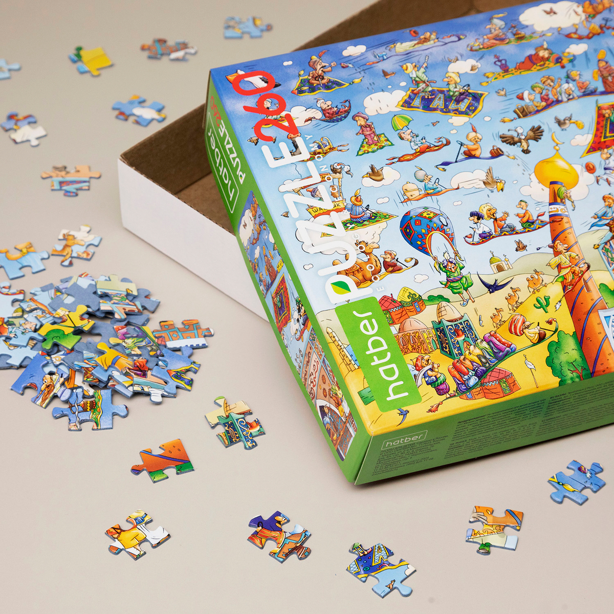 Небо над восточным городом оживлено: ковры-самолёты летят во все стороны, пассажиры машут друг другу, а кто-то явно не справляется с управлением! Смешные персонажи, богатые восточные узоры и мельчайшие детали заставляют рассматривать эту картину снова и снова. Собирать этот пазл — значит шаг за шагом открывать забавные сценки и находить неожиданные детали.