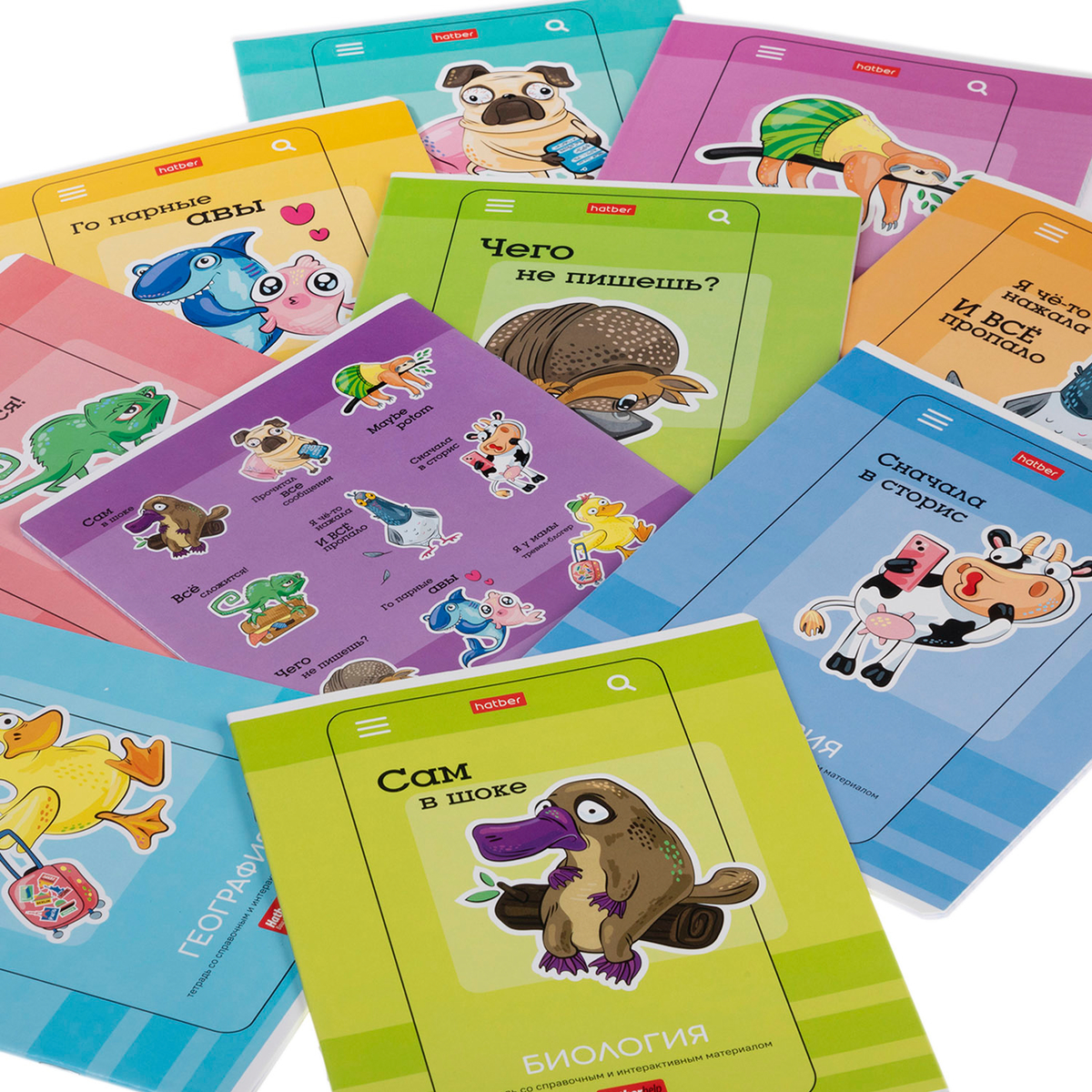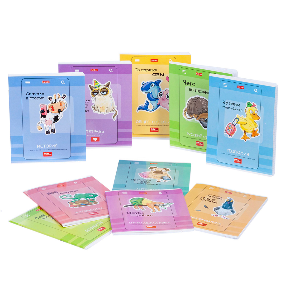 Представляем вам комплект предметных тетрадей «Статусы» в необычном формате листажа. В составе комплекта имеется десять предметных тетрадей, каждая из которых содержит по 24 листа. В данном комплекте представлены следующие предметы: история, литература, география, обществознание, русский язык, информатика, английский язык, биология, математика, а также особая тетрадь под названием «для любимого предмета», которую вы можете выбрать самостоятельно в соответствии с вашими предпочтениями.