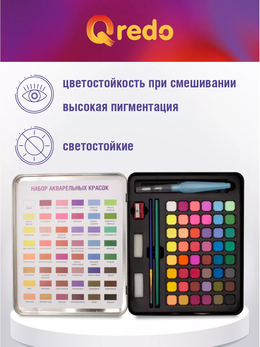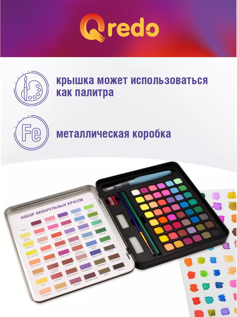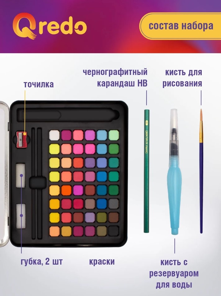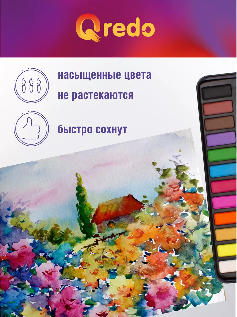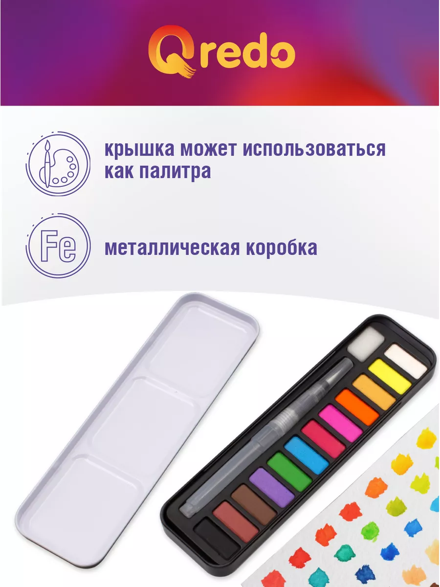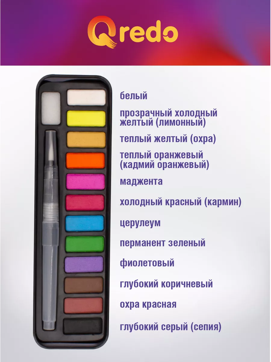 Неважно, где настигнет вдохновение — полупрофессиональная сухая акварель QREDO в компактном металлическом кейсе создана для зарисовок и этюдов. Насыщенные пигменты ложатся на бумагу ровным слоем, прекрасно смешиваются между собой и быстро высыхают, сохраняя яркость цветов.