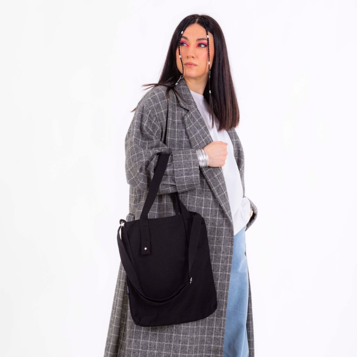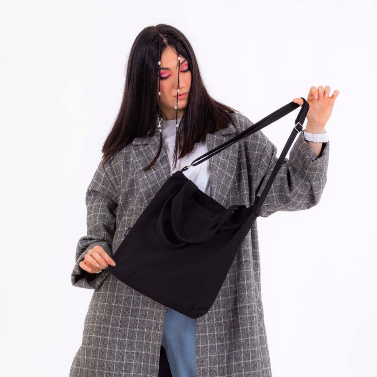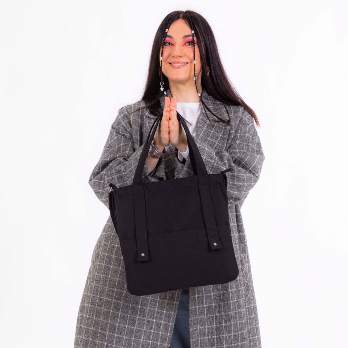 Главная фишка моделей — лаконичный чёрный дизайн, дополненный только декоративными чёрными ремешками и металлическими клёпками. Такие шоперы выглядят стильно и универсальны для любого стиля и возраста.