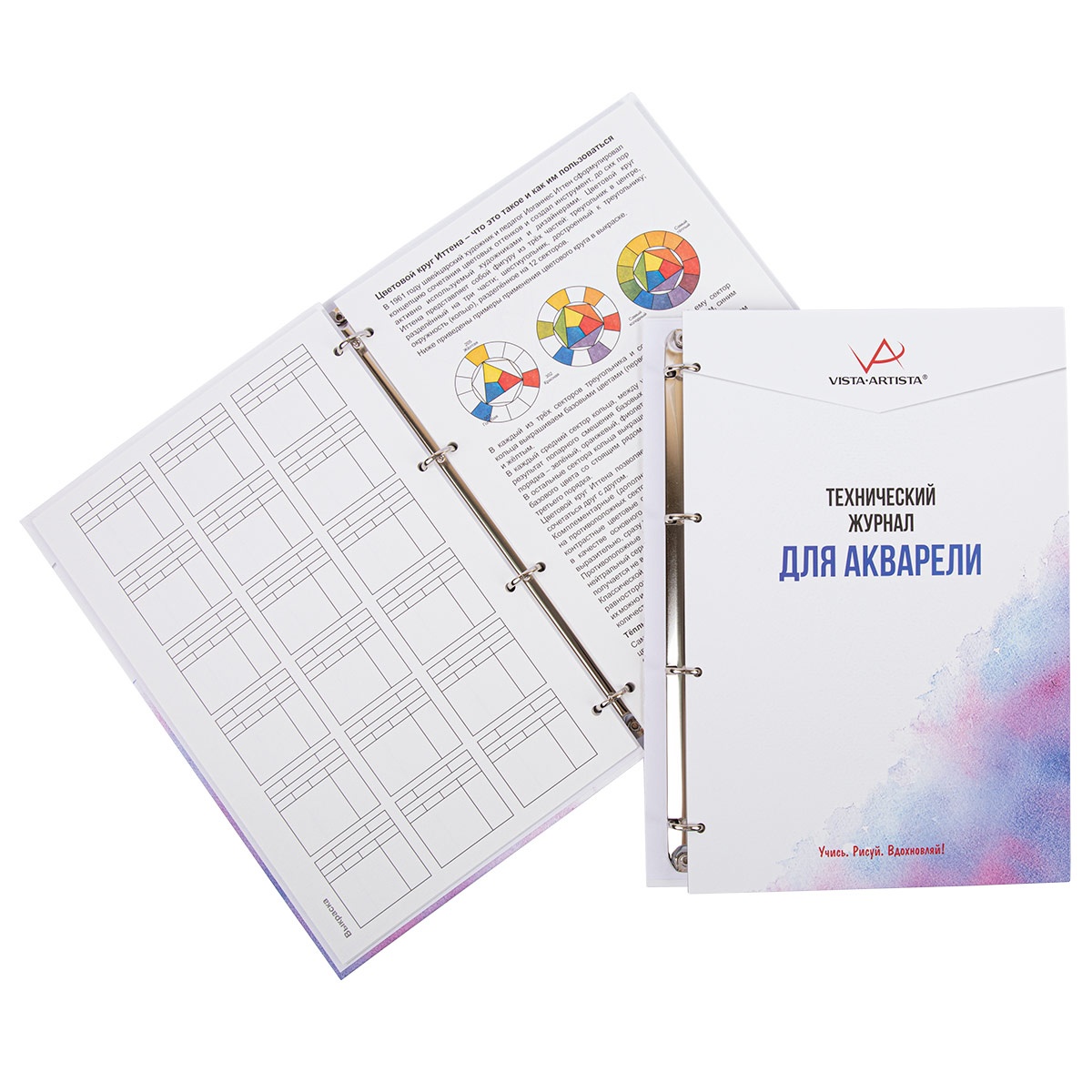 Внутри журнала вы найдёте полезную информацию об акварельных красках, их составе и свойствах, основы смешения цветов. На блоках для выкраски вы сможете протестировать светостойкость и укрывистость ваших акварельных красок, создать свой цветовой круг.