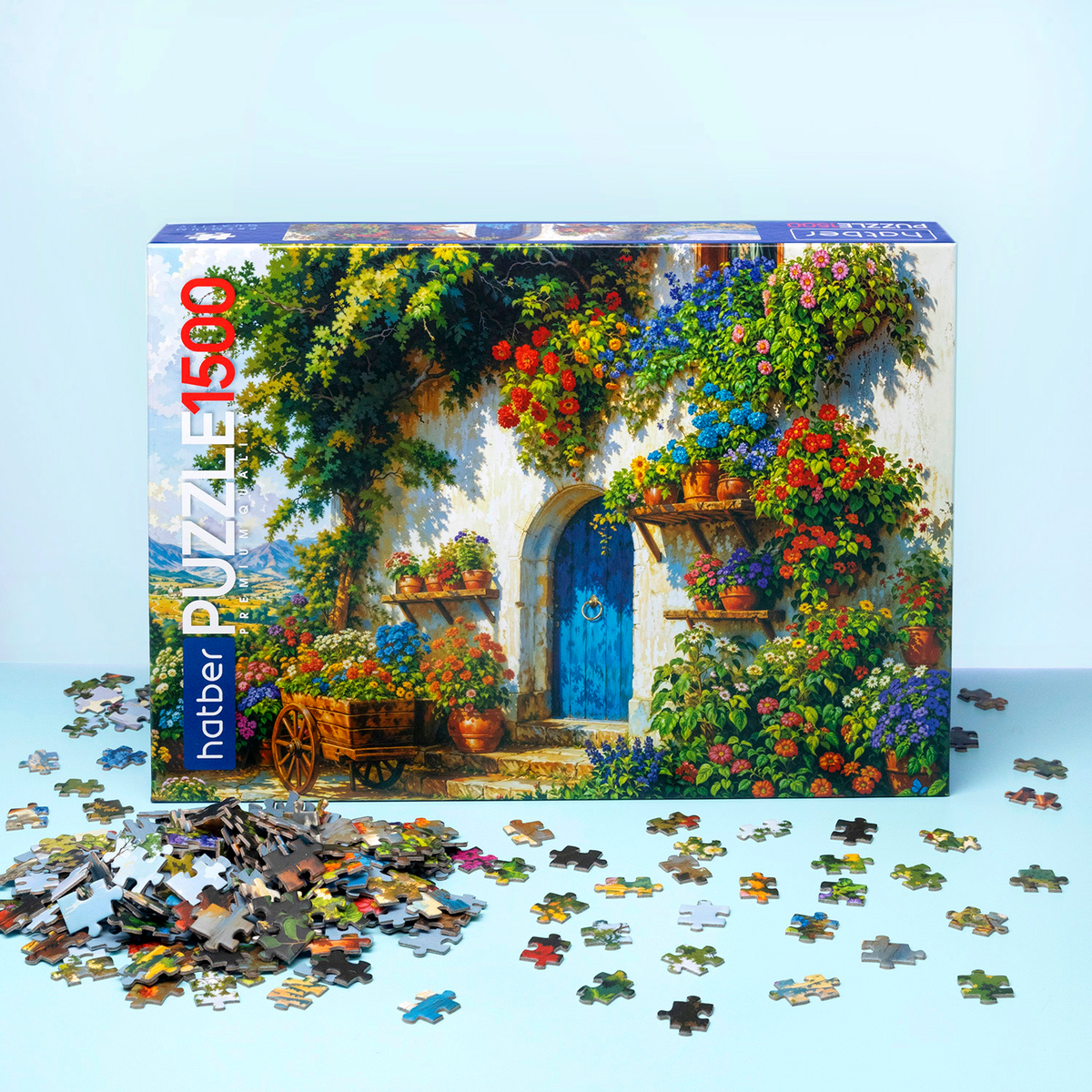 Пазл «Живописный уголок» на 1500 элементов — это приглашение заглянуть в идеальный уголок, где каждый сантиметр залит солнцем. На картине — старинная стена с ярко‑синей дверью, у которой тесно соседствуют деревянная тележка, глиняные горшки и целые каскады цветущих растений, поднимающихся по фасаду и образующих настоящий зелёный водопад.