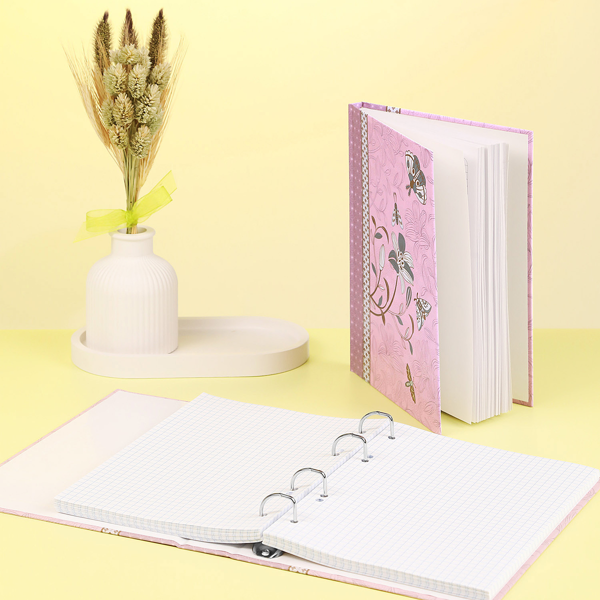 Тетрадь на кольцах и бизнес-блокнот с фирменным дизайном коллекции Muse: две полосы с утончённым орнаментом, изящный цветочный принт. Пастельно-розовая палитра порадует глаз всех любительниц романтичного изысканного стиля.