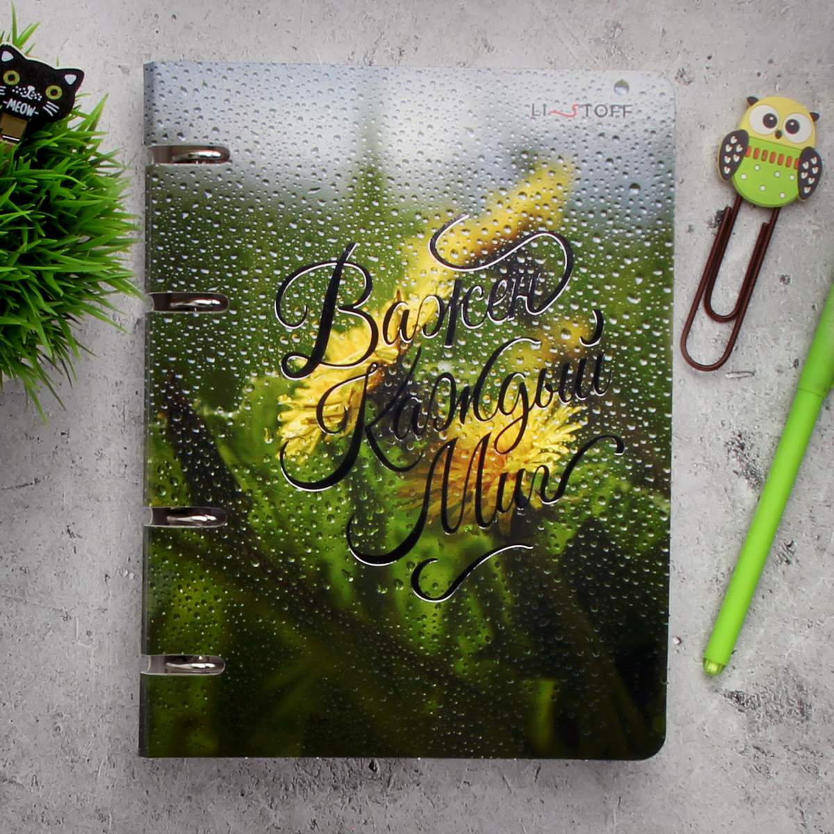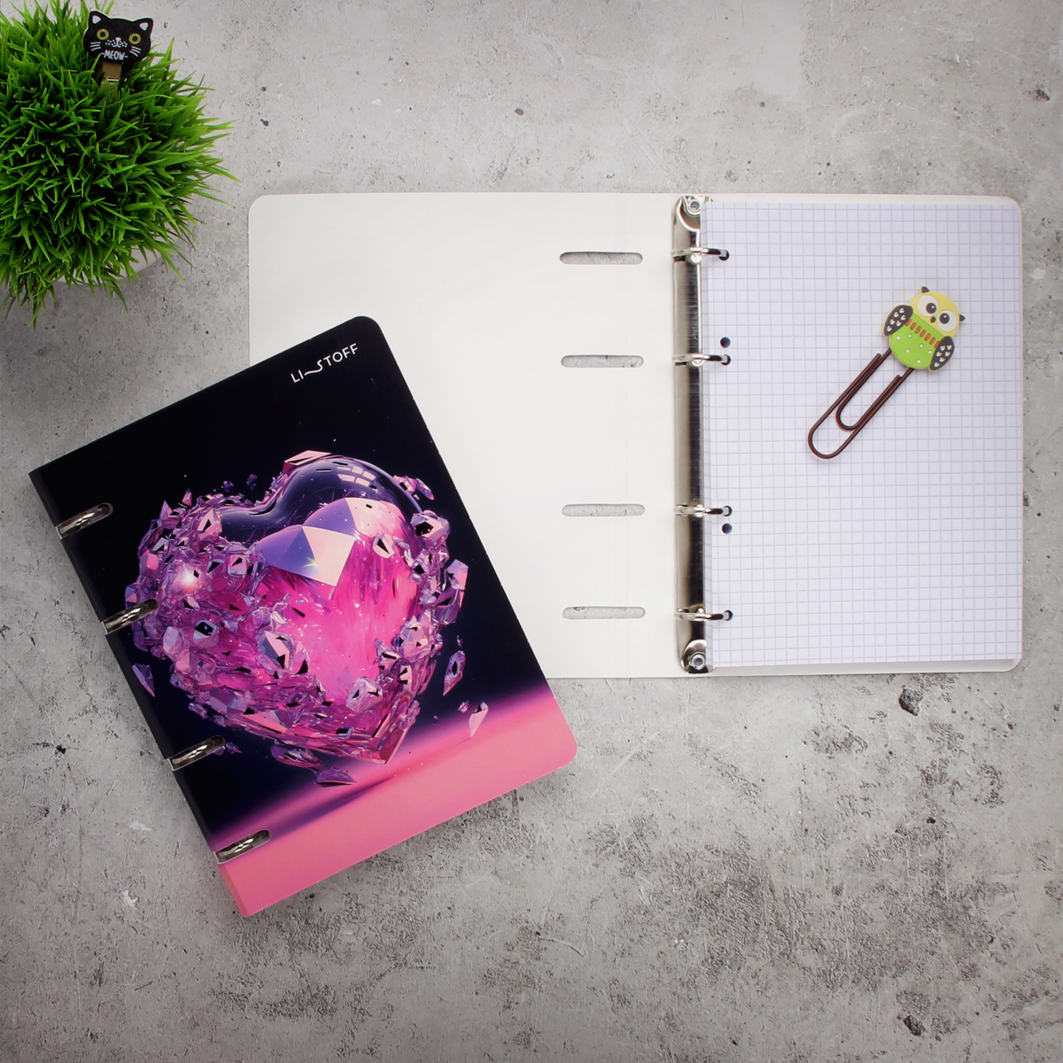 Тетрадь на кольцах listoff А5-формата — идеальный инструмент для студентов и школьников. Обложка с разнообразными дизайнами на любой вкус, удобный формат — комбинация для тех, кто в тренде! Твёрдая обложка с глянцевой ламинацией долго сохраняет презентабельный вид тетради, а тиснение фольгой придает ей блеск. Внутренний блок: сменный, 100 листов, белая офсетная бумага 60 г/кв. м, линовка в клетку. Идеальное сочетание цены и качества.