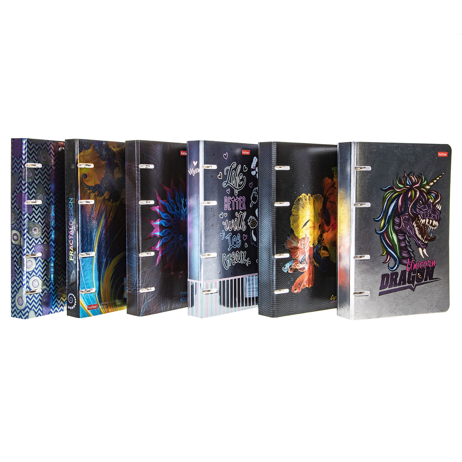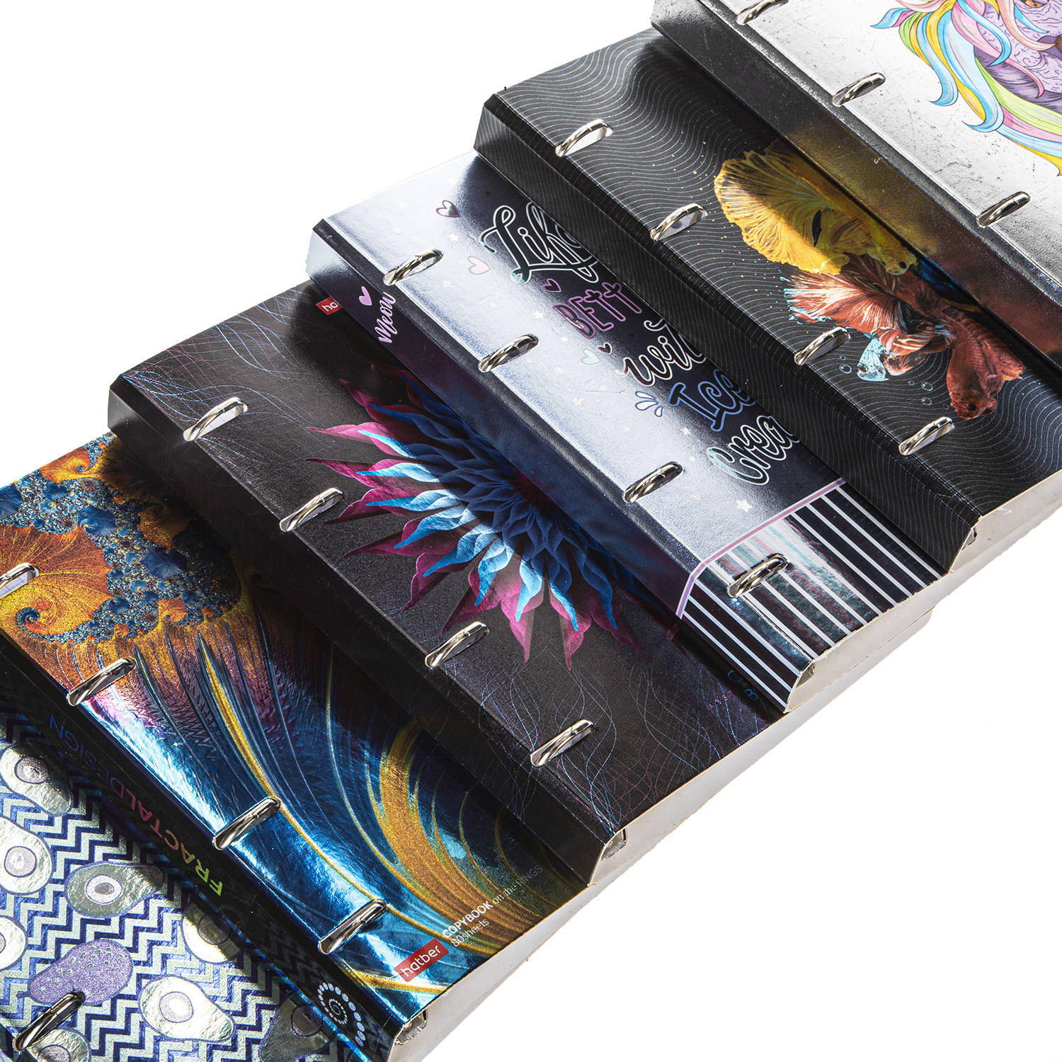 Яркие обложки из слим-картона с высечкой под кольца выполнены из металлизированного картона, а для добавления глубины рисунка дизайнов использован выборочный лак. В тетради уже имеется внутренний блок на 80 листов, который идёт в термоусадочной плёнке для защиты от загрязнения.