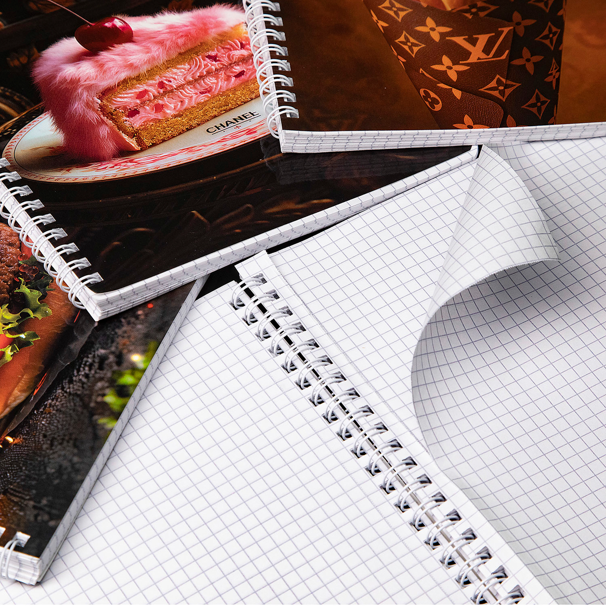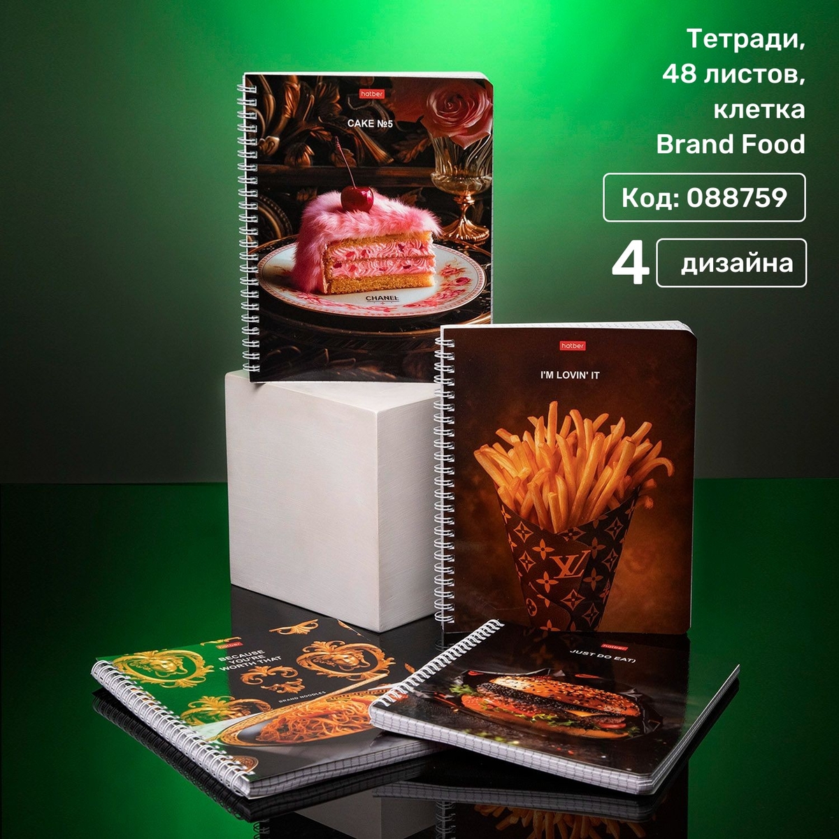 Hatber представляет 3 серии тетрадей Brand Food — трибьют современному культу еды. Бургеры с красной и чёрной икрой в пергаменте с брендовым узнаваемым принтом, ассоциация с именитыми домами моды и роскошь - вот три кита, на которых строятся дизайны тетрадей формата А5 на гребне с глянцевыми обложками.