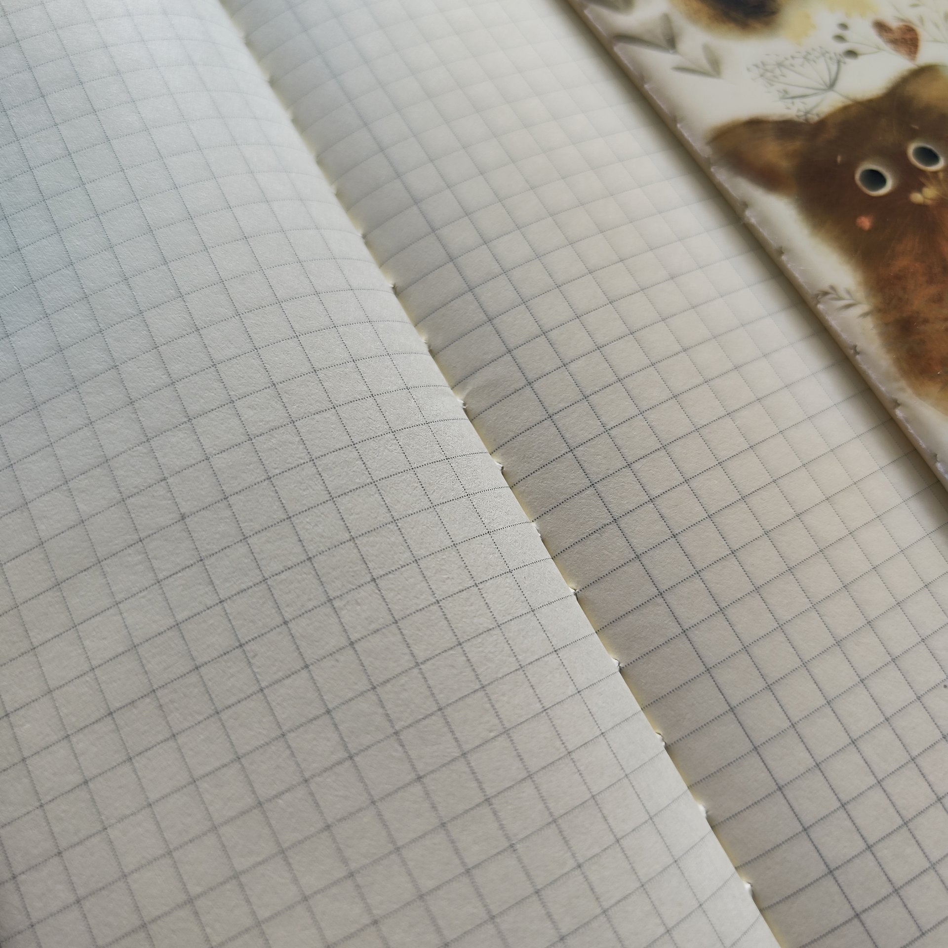 Тетрадь прошита прочной нитью. Внутренний блок содержит 30 листов в клетку и изготовлен из бежевой бумаги плотностью 70 г/кв. м. Скруглённый угол обложки и блока предохраняет листы от замятия.