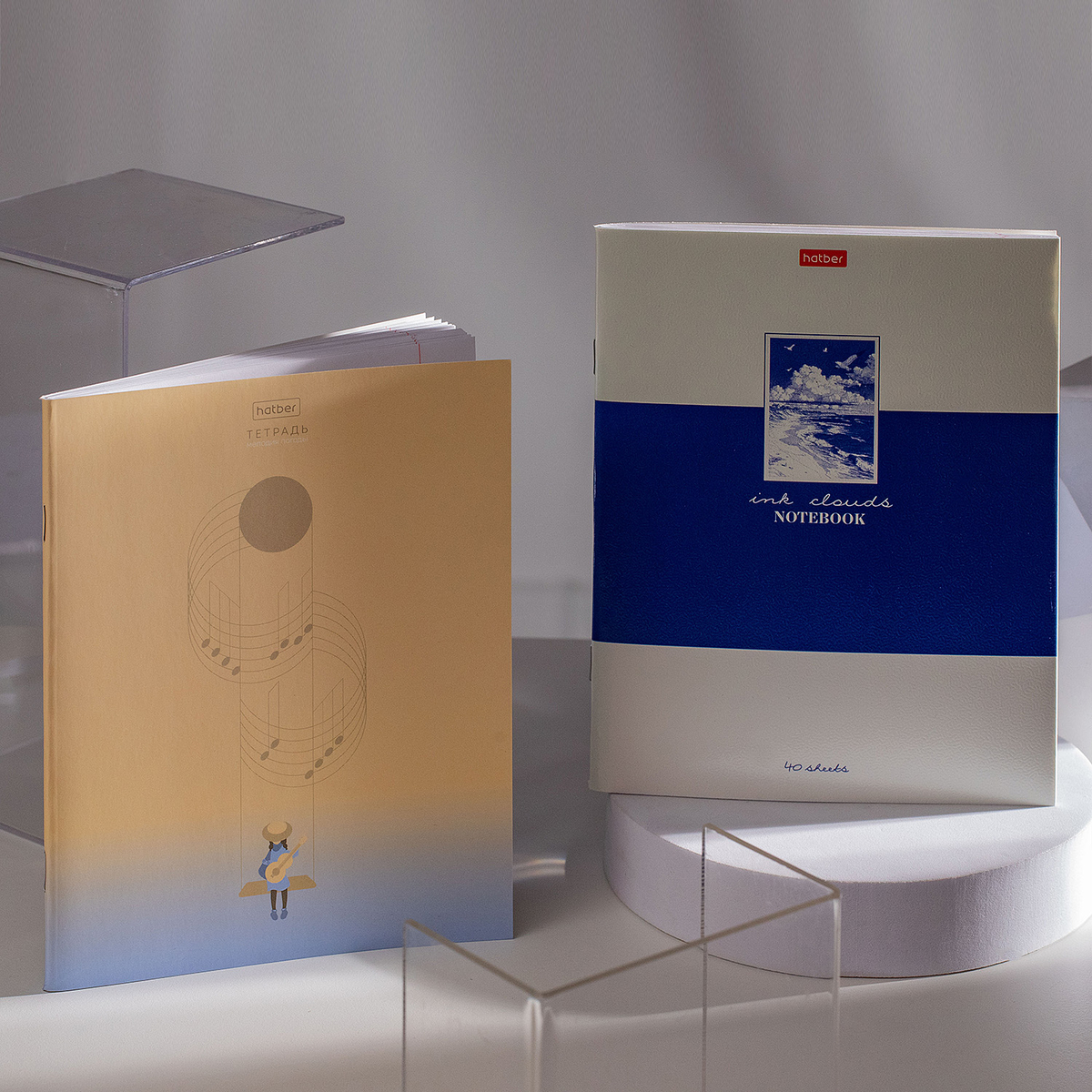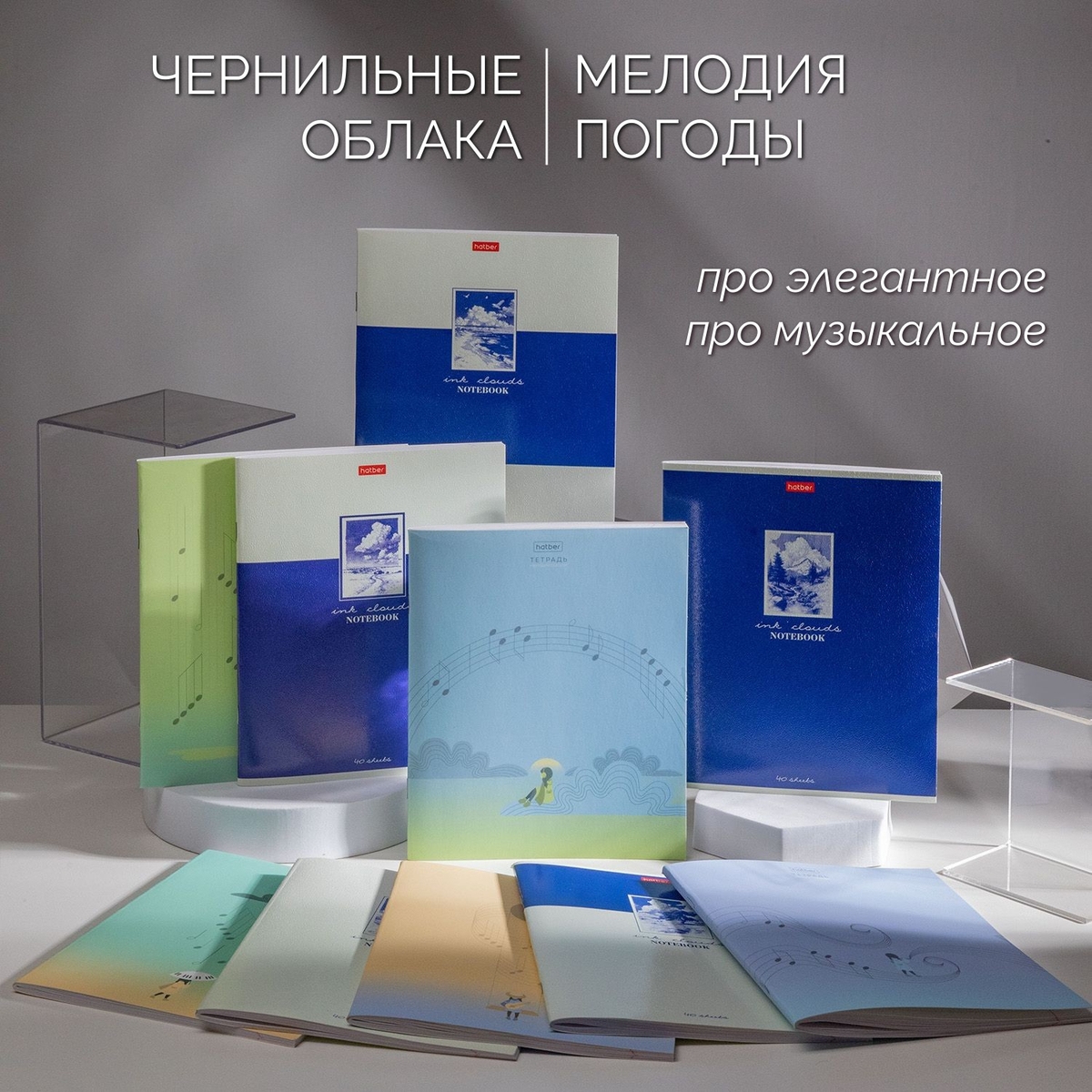 «Чернильные облака» — тетради, в которых живёт простор. Сочетание белого и синего, в котором отдыхают глаза от городской суеты. Небо и облака, морская вода и белая пена. Умиротворение.