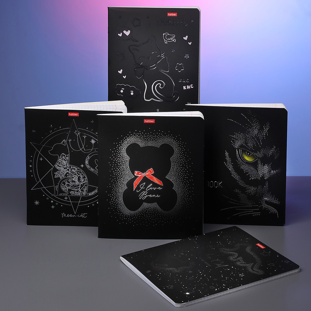 Hatber представляет магические, мистические тетради серии «Кошки-мишки» — это сочетание элегантности, милоты и загадки. Плавные силуэты грациозных кошек, острые линии звёзд, знакомые очертания плюшевого медведя на чёрном фоне выглядят стильно и минималистично. 3D-фольга дополняет каждый дизайн обложки, а в некоторых акцентом становятся яркие цветовые пятна.