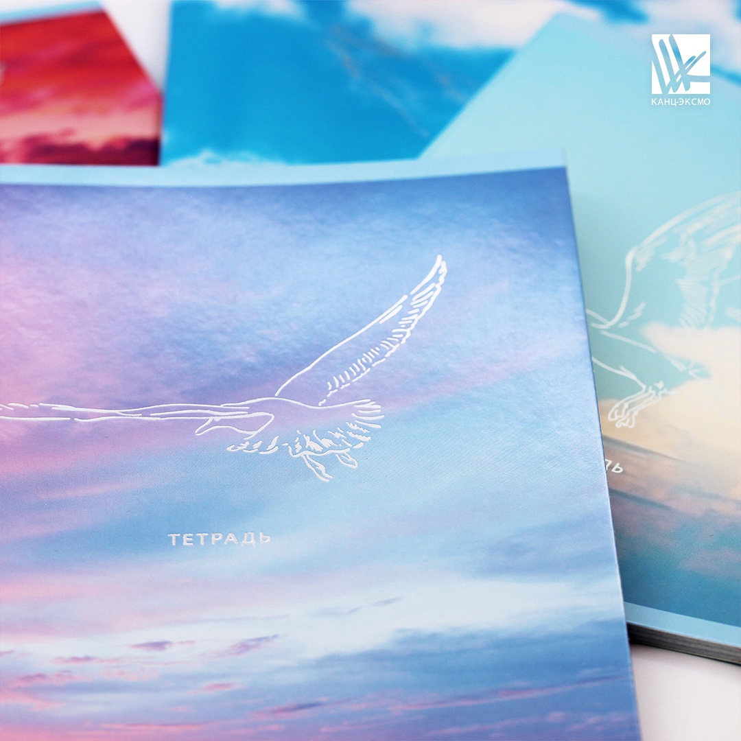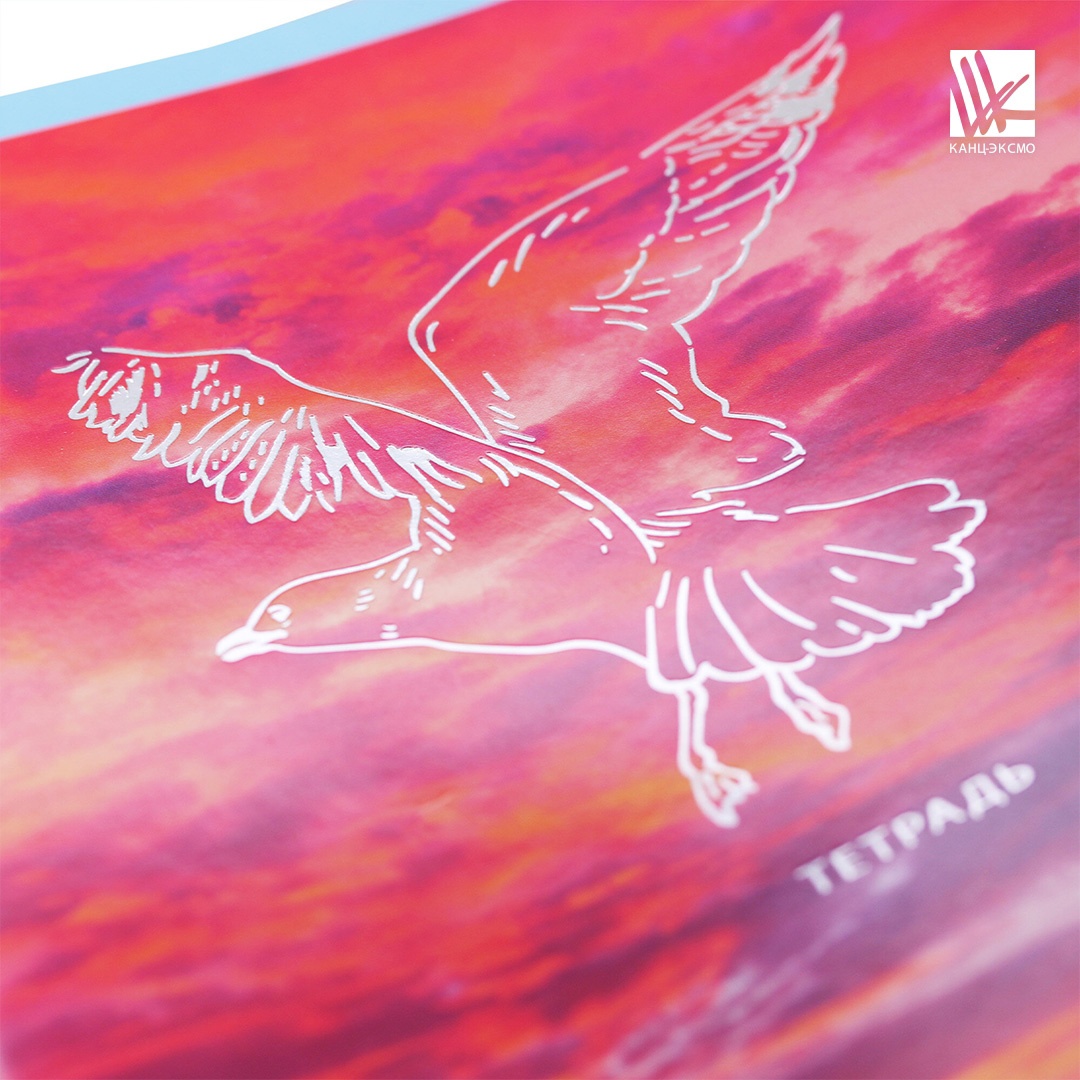 Птицы на фоне красочного неба станут выбором романтичных и мечтающих натур. Классический внутренний блок в клетку делает тетрадь универсальной в использовании. Тиснение фольгой красиво переливается и притягивает внимание. Крепление скрепка.