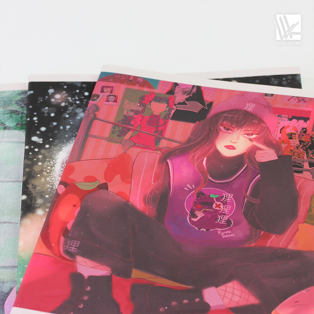 Дизайн выполнен в нежных пастельных оттенках с романтичными сюжетами в рисовке аниме. Ламинация «мокрый шёлк» имеет тактильно-приятный эффект, что заставляет прикасаться к тетради снова и снова. Обложка тетради изготовлена из мелованного картона.