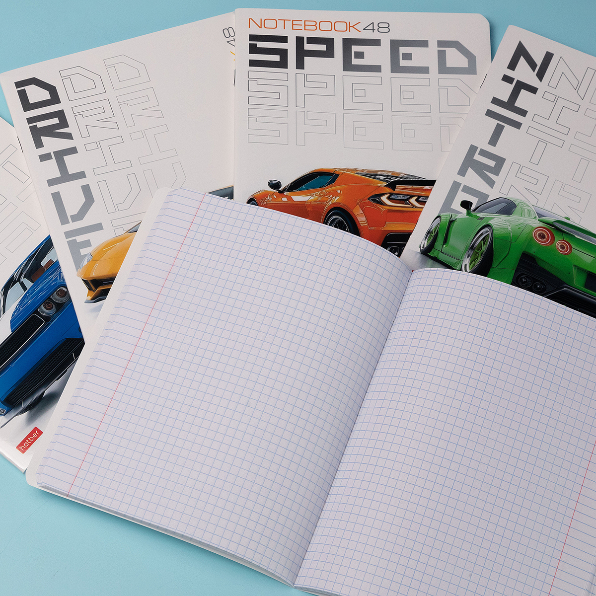 Крутые гоночные тачки — эстетика особая, дерзкая, хлесткая. Парни точно знают! На обложках тетрадей она дополнена типографикой и декоративными элементами в цвет машины.