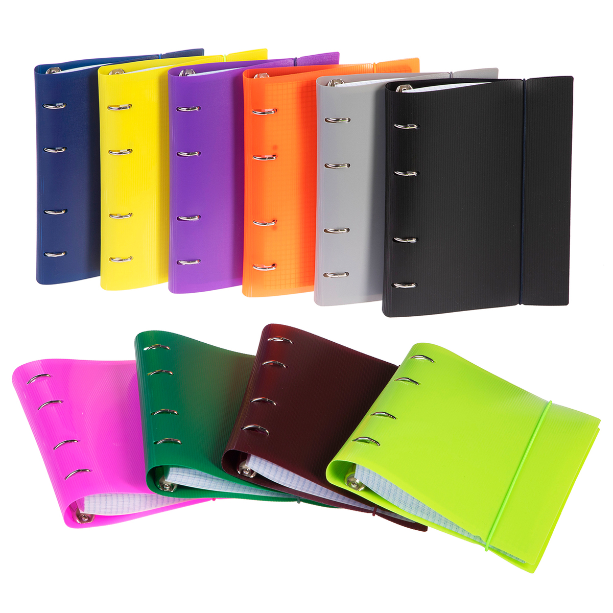 Стильные и универсальные тетради подойдут для важных записей и заметок. Пластиковая обложка с высечкой под кольца дополнительно защитит от загрязнений и продлит срок эксплуатации. А удобная резинка позволит избежать нежелательной деформации обложки и обеспечит сохранность внутреннего блока, который, кстати, так же имеется внутри. Внутренний блок состоит из 120 листов и упакован в термоусадочную плёнку для защиты от загрязнения.