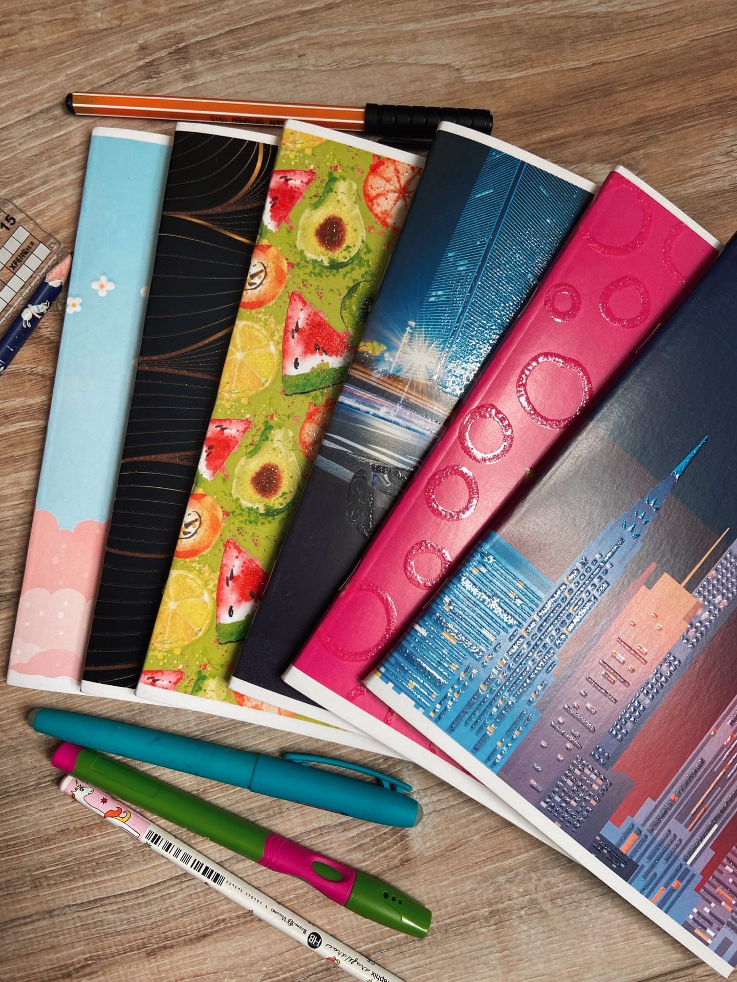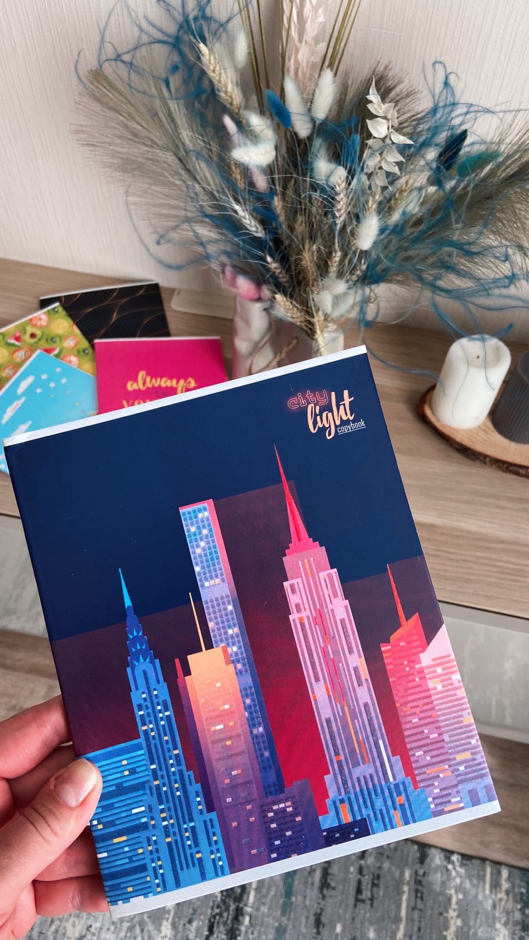 Ночной город, фрукты, корзина цветов — у каждой обложки есть особое настроение. Каждая обложка имеет эффект блёсток. Каждая тетрадь по-особенному важна.
