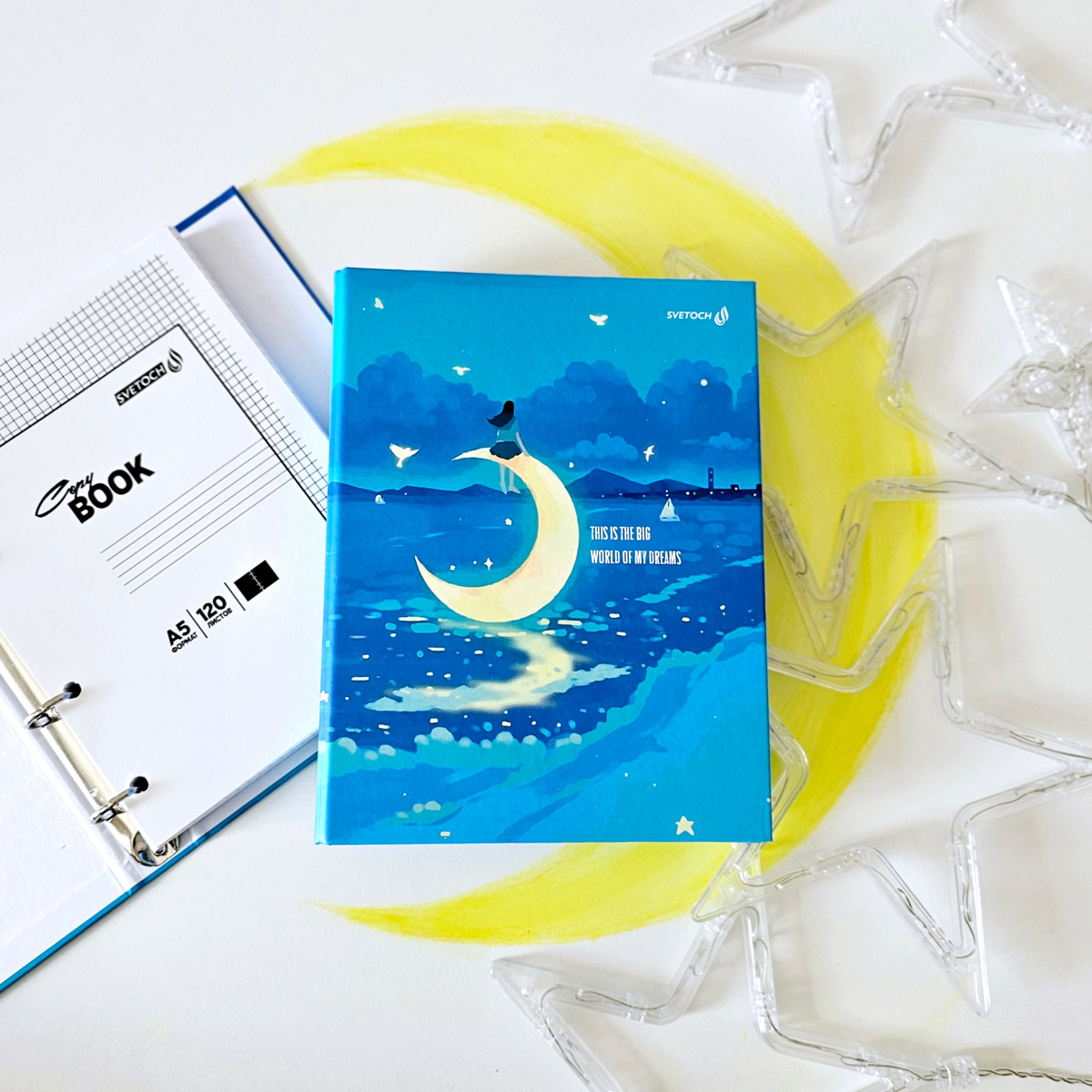 Нежная и мечтательная серия тетрадей от SVETOCH «Созвездие любви» со сменным блоком на кольцах — это лирика в голубых тонах. Тонкий серп полумесяца, море и звёзды погружают в атмосферу молодой влюблённости и вдохновляют, вдохновляют!..