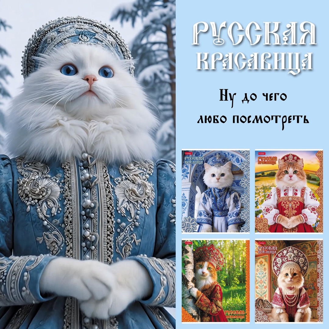Тетради «Русская красавица» от Hatber — ещё один свежайший экземпляр, посвященный новому взгляду на русскую традицию. В дизайне чёткая концепция. Концепция красивой котейки.
