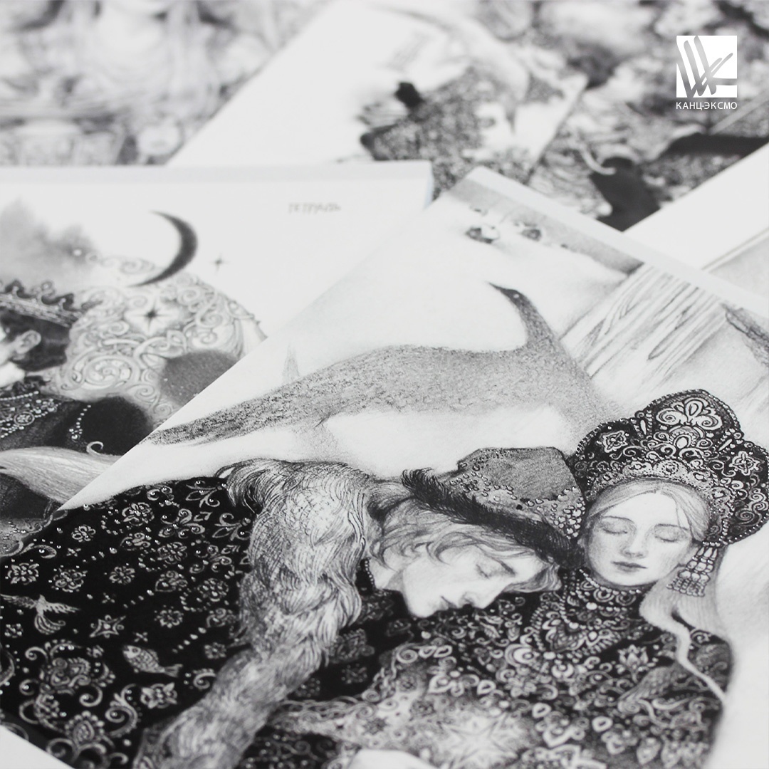 Дизайн обложки — эксклюзив, который разработан совместно с художником, изображает мотивы русских сказок. Классический внутренний блок в клетку делает тетрадь универсальной в использовании.