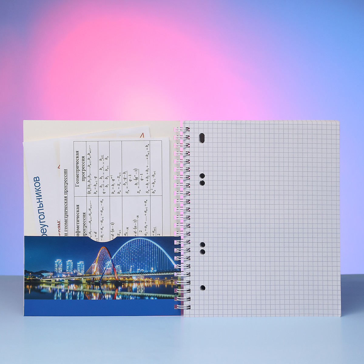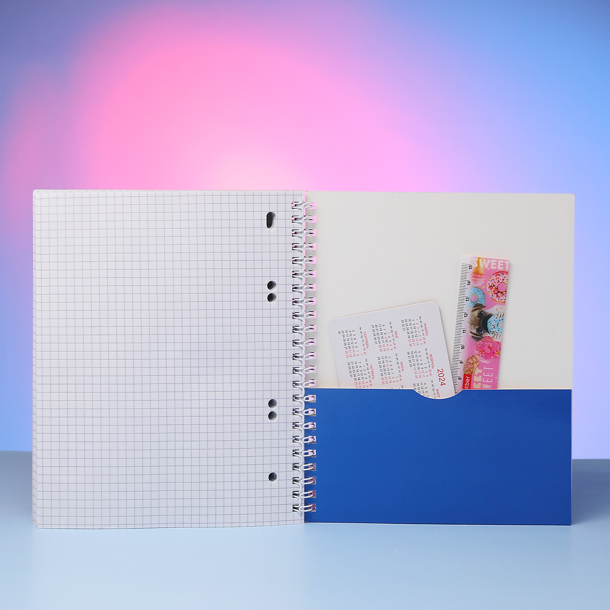 Два специальных кармана расположены с внутренних сторон передней и задней обложек. Очень удобно, когда к тетрадным записям прилагаются дополнительные материалы: таблицы, подсказки с формулами. В карманы также можно положить линейку или другой тонкий предмет — например карманный календарик.