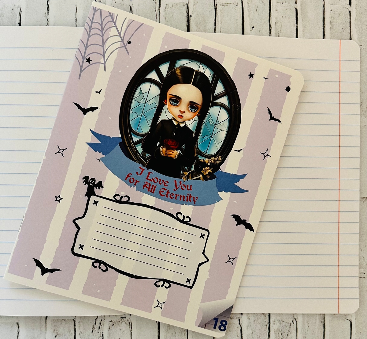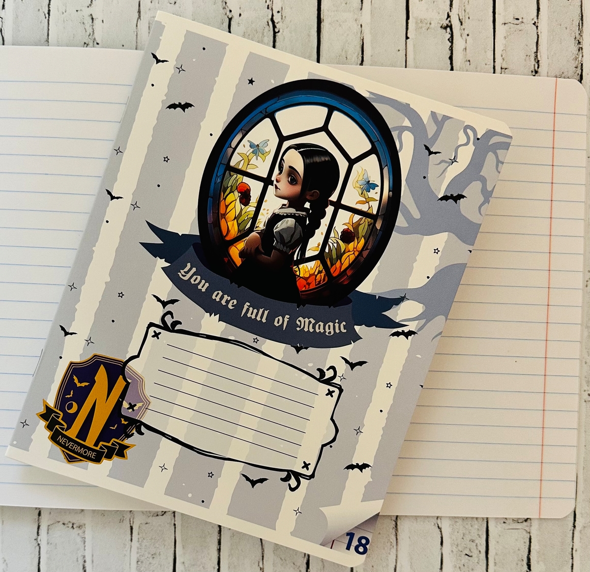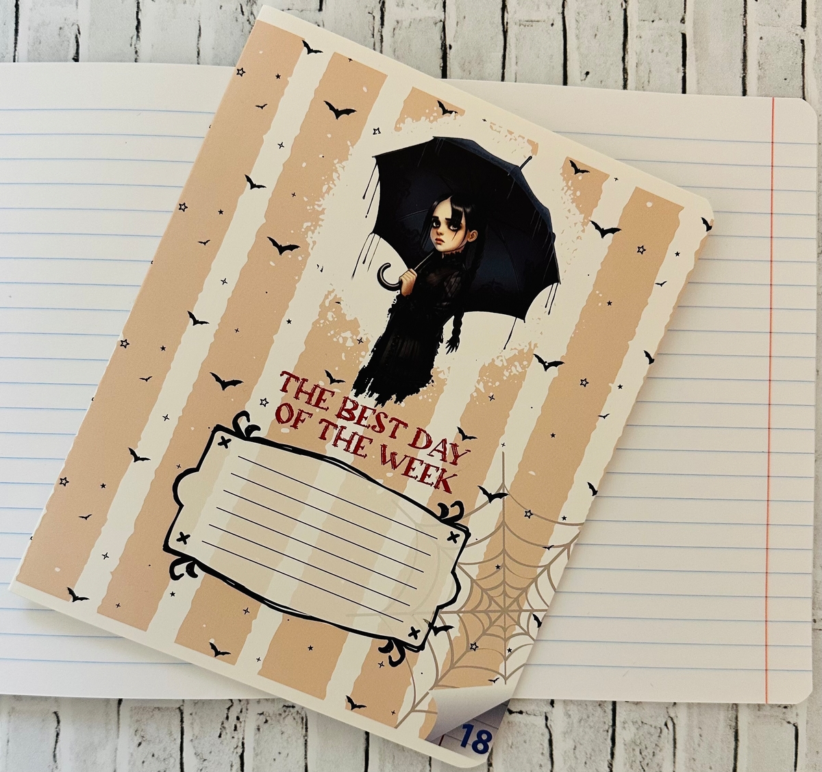Внутренний блок с разлиновкой в линейку с полями и обложка скреплены с помощью металлической скобы.