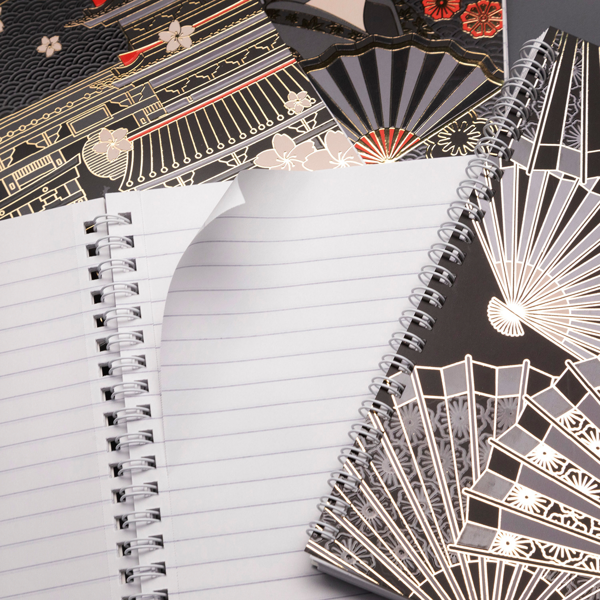 Танцующие журавли, красный круг солнца и легендарные бумажные фонарики. Цветовой минимализм и сочетание мелких орнаментов. Дизайны дополнены матовой ламинацией, 3D-фольгой и 3D-лаком.