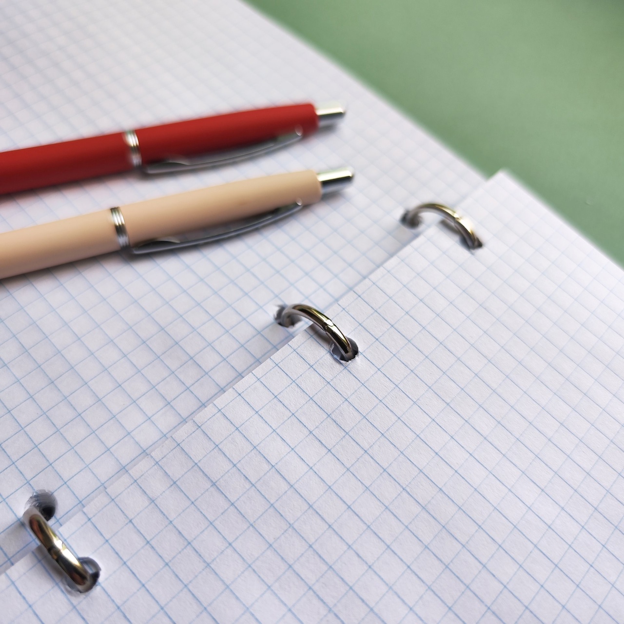 Для увеличения прочности тетради обложку ламинируют глянцевой пленкой. На внутреннем кольцевом механизме закреплены 160 листов в клетку. Преимущество тетради на кольцах — возможность варьировать порядок листов и толщину блока.