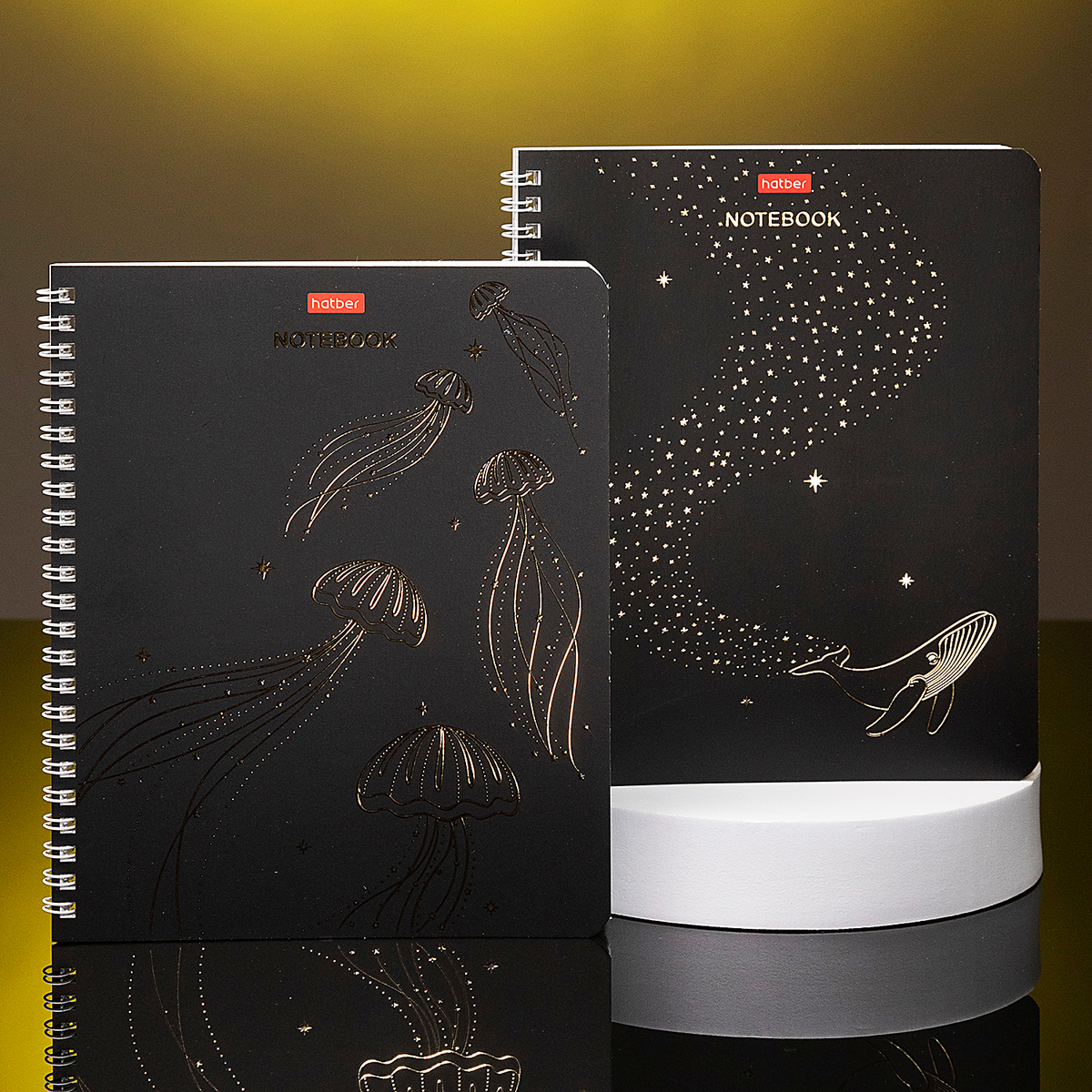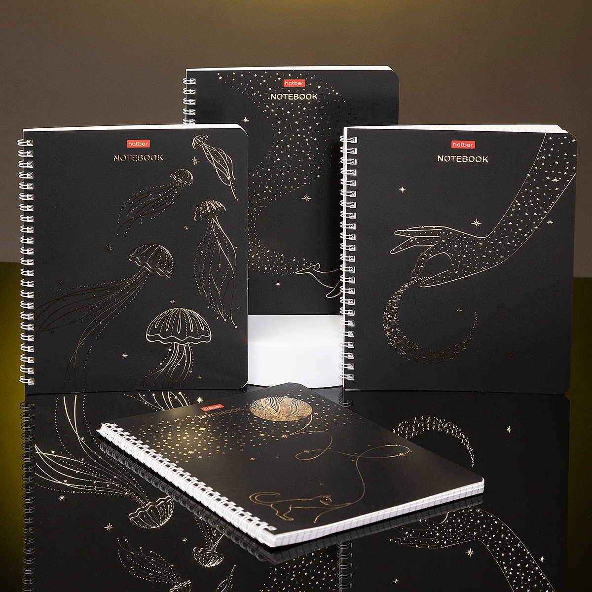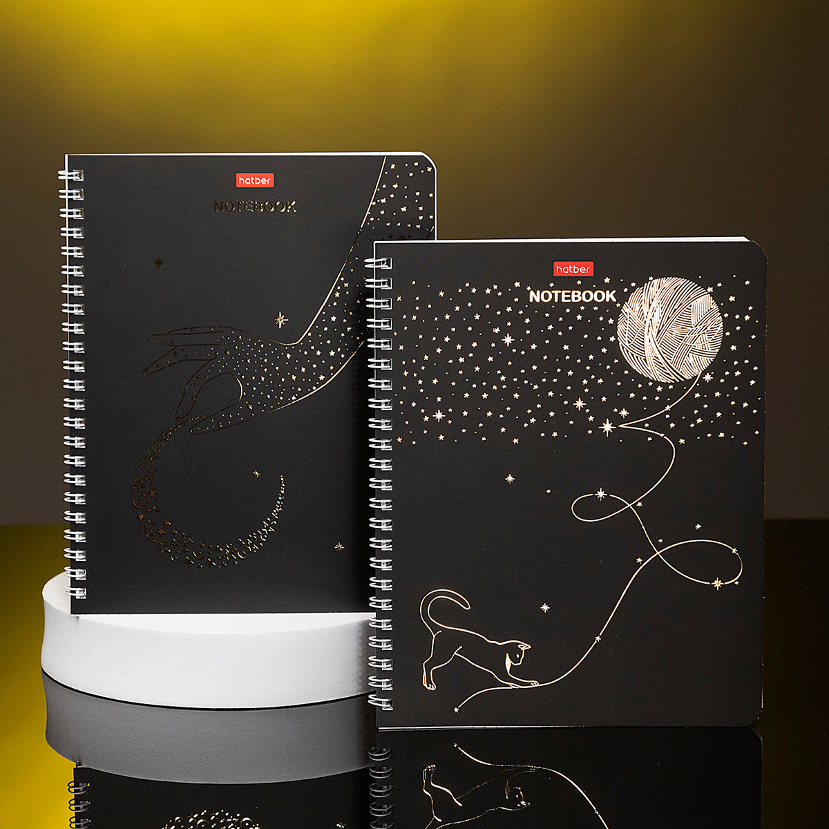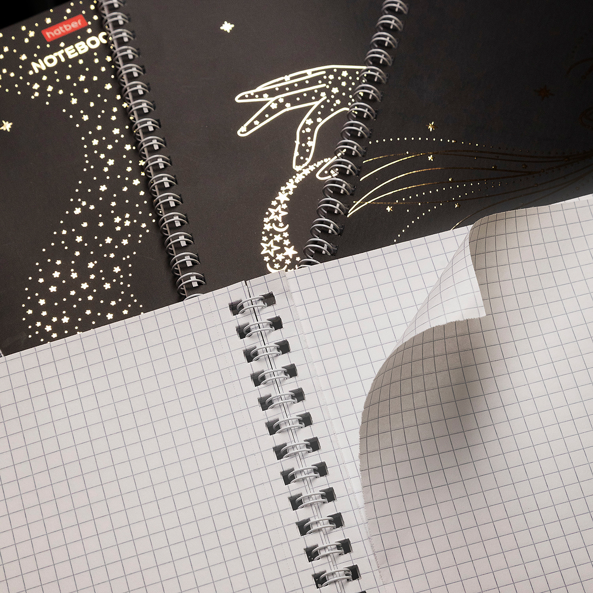 Hatber представляет минималистичную астрономическую серию тетрадей «Золотая магия» на гребне. Сияние звезд на фоне чёрного неба складывается в красивую историю.
