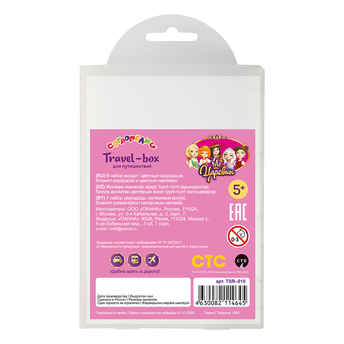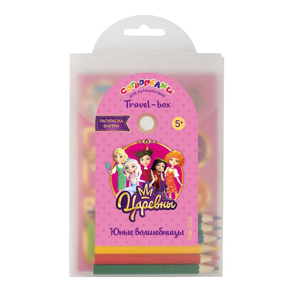 ТМ «Сотворелки» приглашает поучаствовать в увлекательных приключениях вместе с travel-box для путешествий «Царевны» и юными волшебницами из популярного мультфильма. Блокнот-раскраска содержит 30 картинок и логических игр и точно не позволит детям скучать в поездке. Тематический набор дополняют яркие наклейки, а надёжный пластиковый бокс поможет ничего не потерять и сохранить всё в целости.