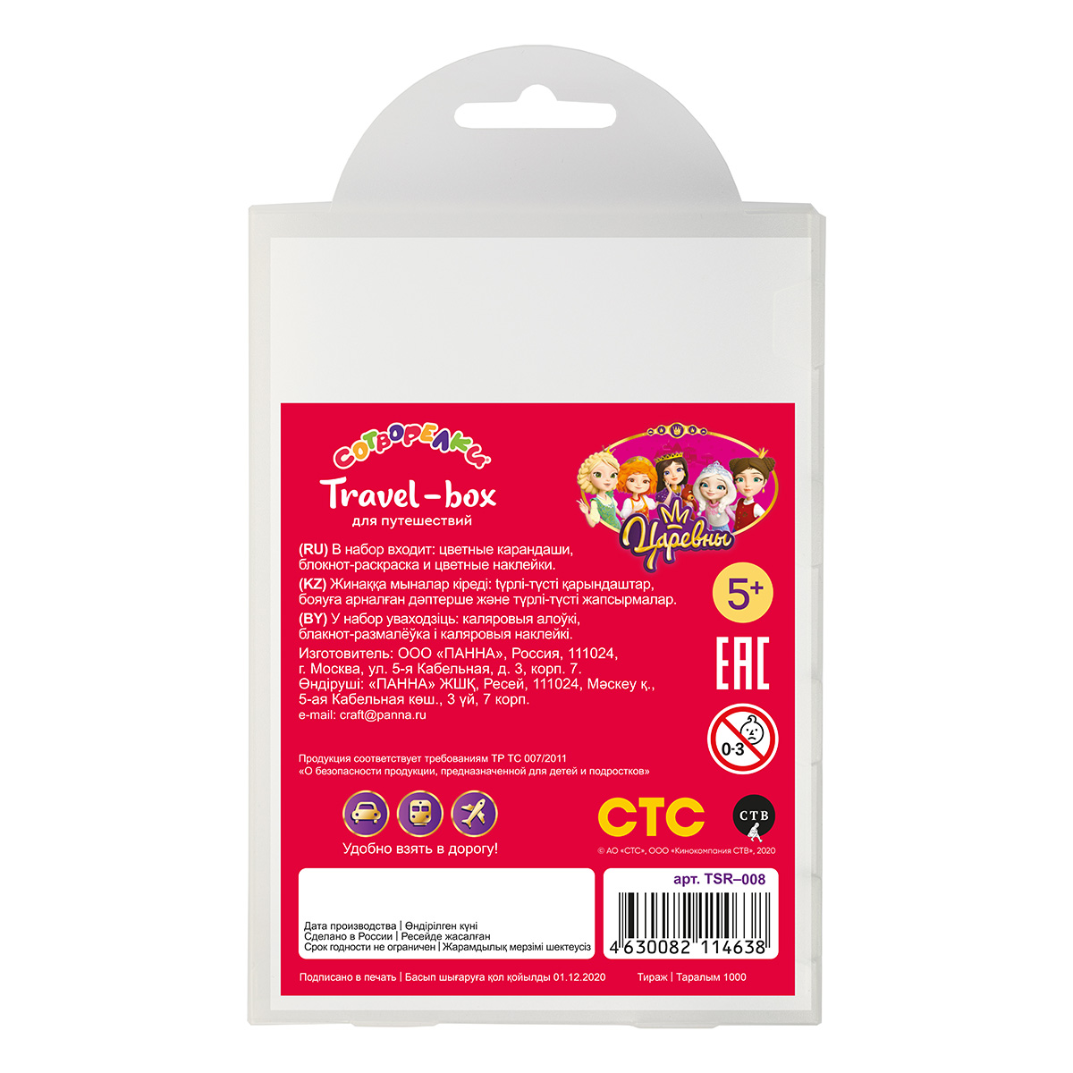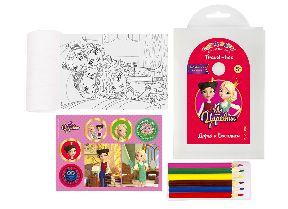 Travel-box для путешествий «Царевны» от ТМ «Сотворелки» — это блокнот-раскраска с 30 картинками и логическими играми. Очаровательные героини популярного мультфильма не дадут детям скучать в дороге.