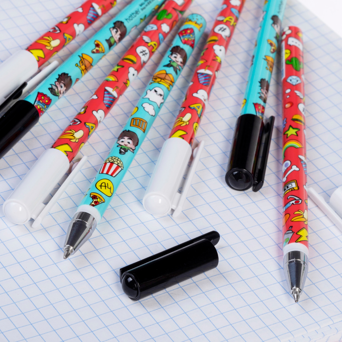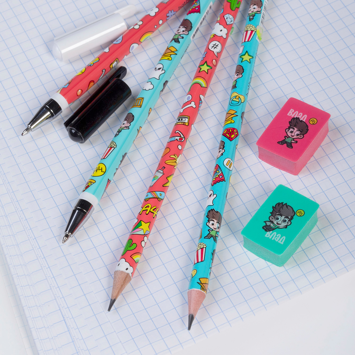 В линейку входят стильные шариковые ручки, чернографитные карандаши, а также яркие ластики оригинальный формы — и всё радует глаз.