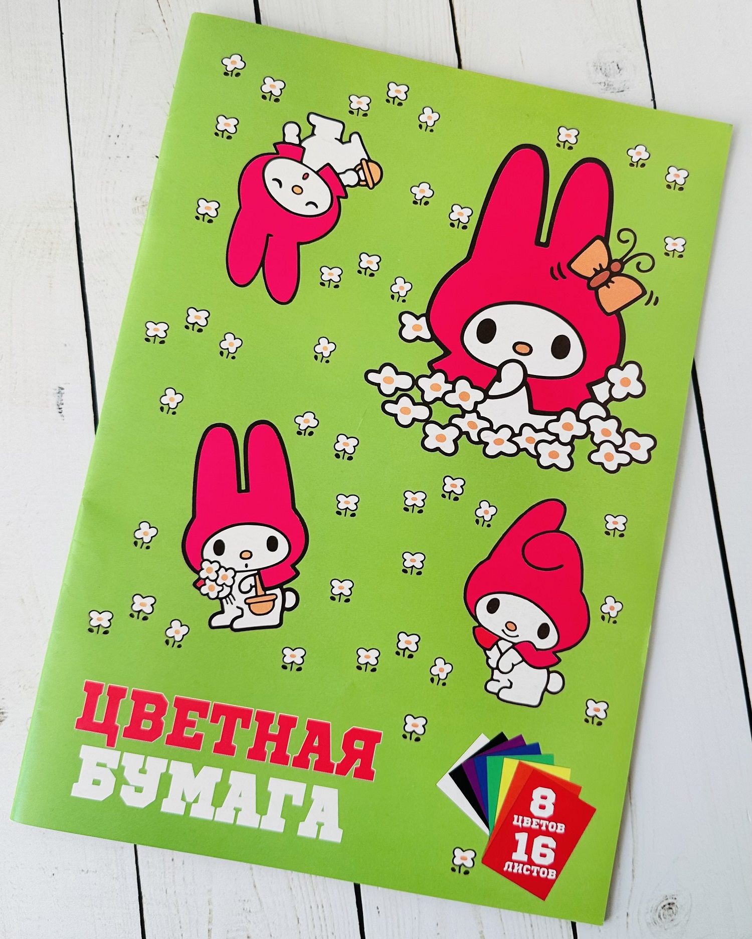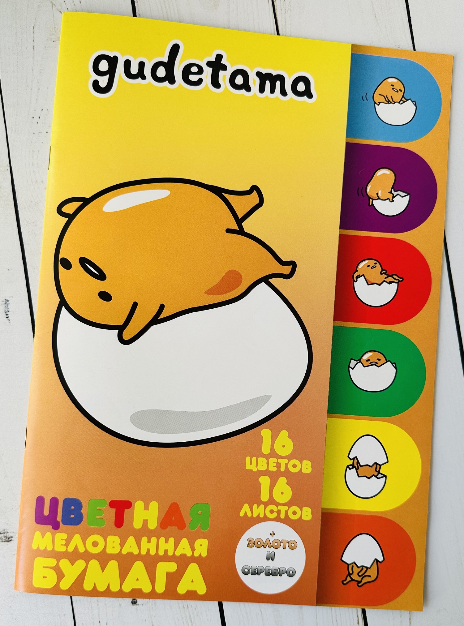 Односторонняя цветная бумага представлена в наборах из 16 листов по 8 и 16 цветов. Цветная мелованная бумага в коллекции «Gudetama, арт.: 71993» дополнена цветами золото и серебро. Бумага имеет яркие насыщенные оттенки, качественную прокраску без пробелов и разводов. Формат — А4. Обложка и бумага скреплены с помощью металлической скобы.