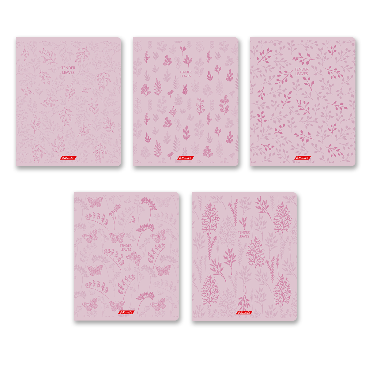 Нежно розовый. Украшенный тонким, утончённым цветочным орнаментом, он радует глаз на обложках общих тетрадей «Цвет нежности». А порхающие среди тонких стеблей бабочки даже в холодную зиму принесут весеннее настроение.