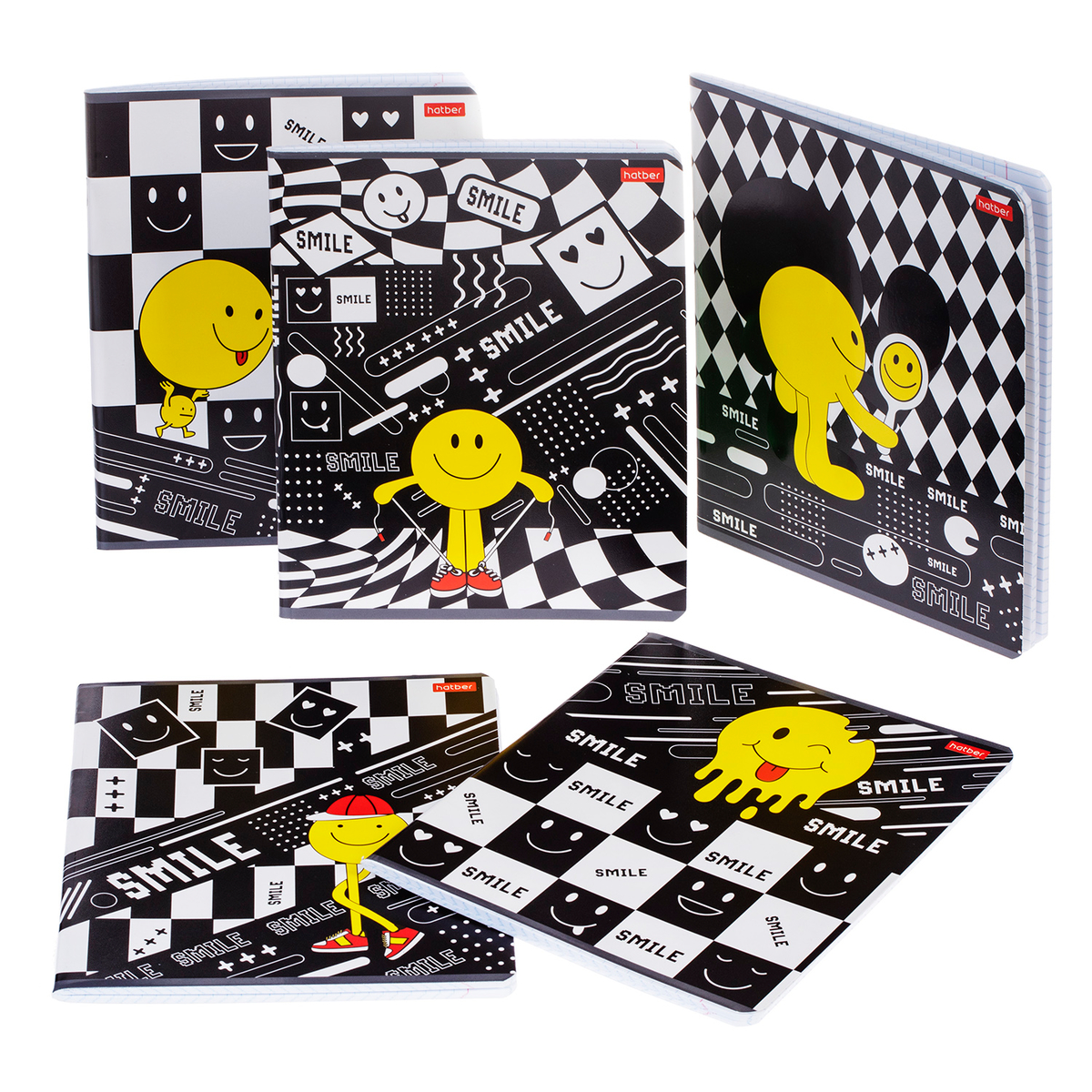 Новые тетради А5-формата 48 листов на скобе в клетку серии Happy smile с выборочным лаком. Их обложки выполнены в стильных чёрно-белых тонах с ярким контрастным элементом в виде весёлого жёлтого смайла. Улыбайтесь чаще, ведь улыбка — это лучшее дополнение к любым записям и идеям.