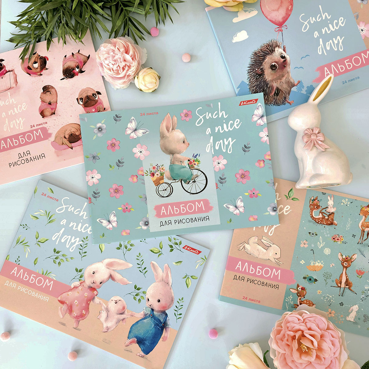 На обложках мятных, пудрово-розовых, небесно-голубых альбомов для рисования «Ребята-зверята» акварельные зайчата, оленёнок и ёжик радуются жизни. Иллюстрации, полные позитива и теплоты, вдохновят детей на множество добрых рисунков!
