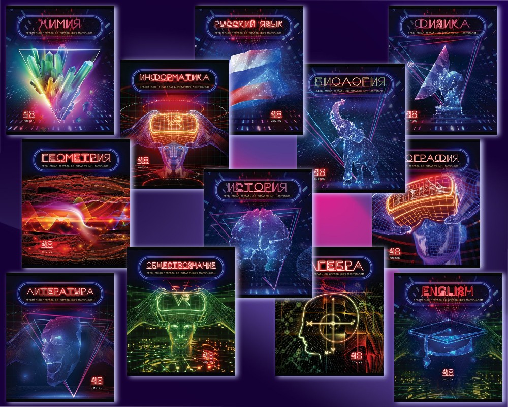 «Виртуальный неон» — это общие тетради 48 листов из 12 предметов, объединённые единой темой оформления.